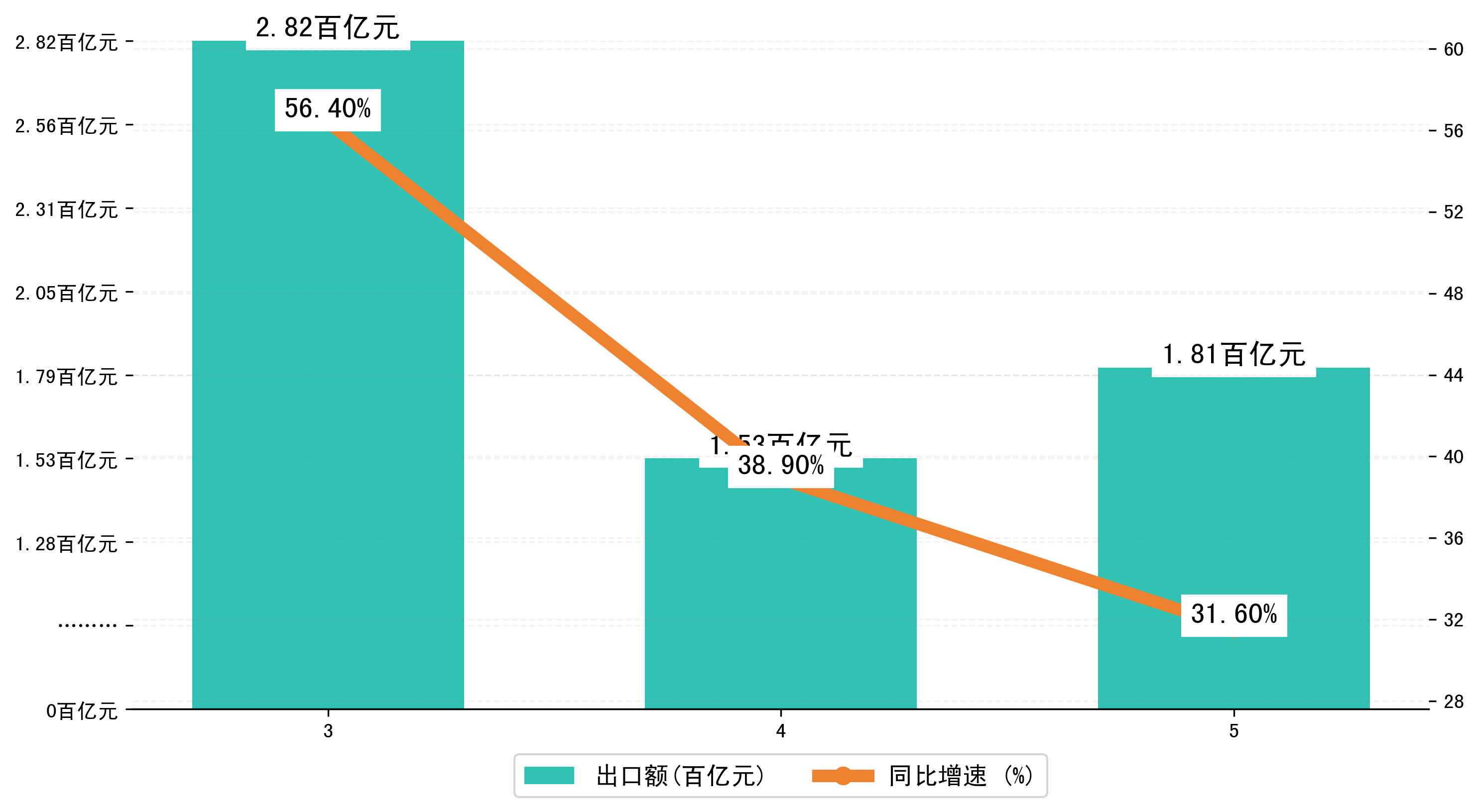 以人民币计,2023年5月福州市出口额为181,4767.3171万元,相比上月增加了28,0228.5881万元;相比上年同期增加了9,5325.9767万元,同比增加了31.60%。