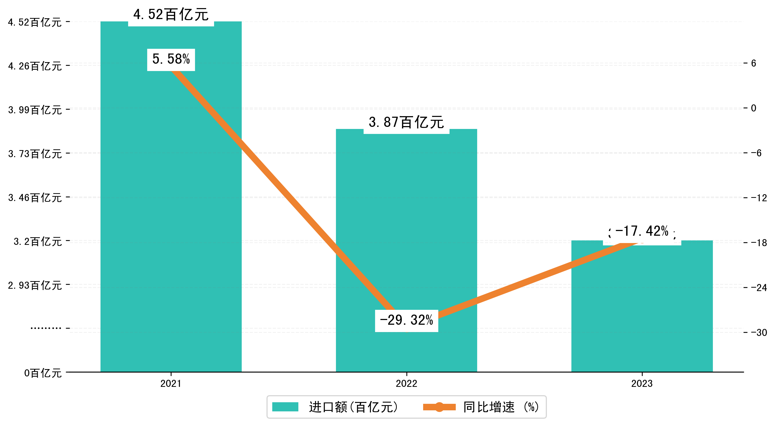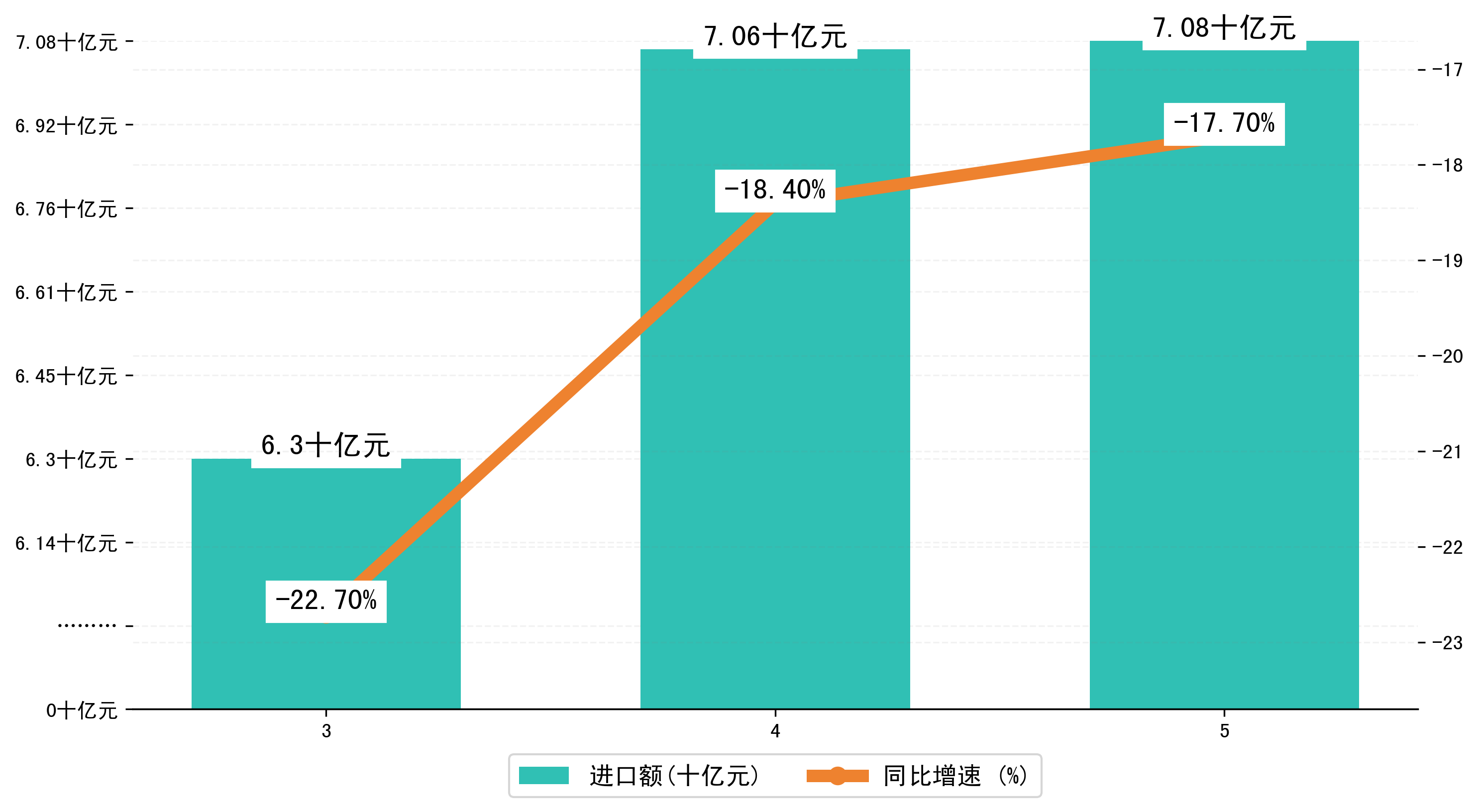 以人民币计,2023年5月福州市进口额为70,7685.6035万元,相比上月增加了1579.6738万元;相比上年同期减少了14,8557.1008万元,同比减少了-17.70%。