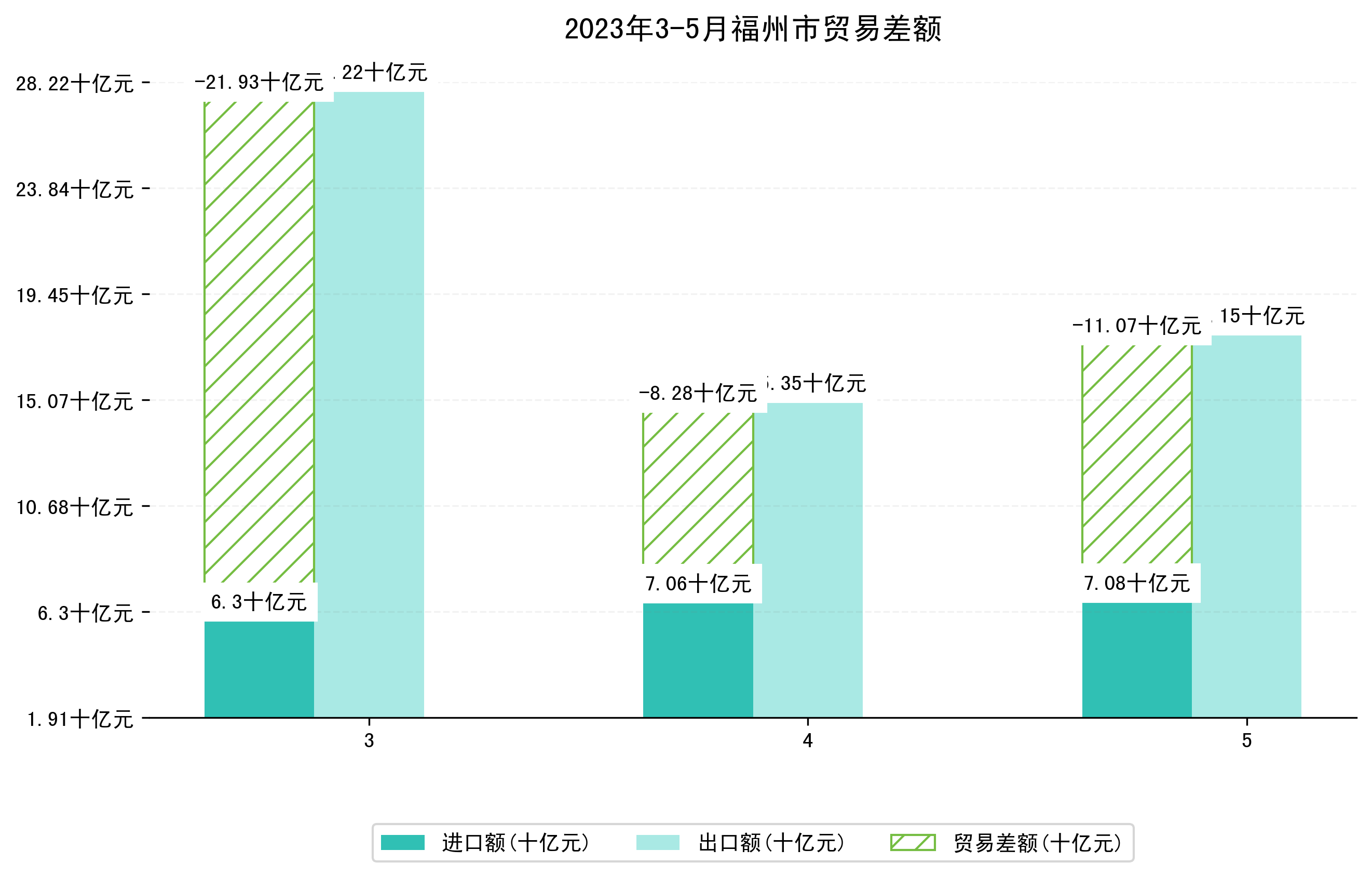 以人民币计,2023年5月福州市贸易差额为110,7081,7136万元(贸易顺差),相比上月增加了27,8648,9143万元,即4,0280,7904万美元;相比上年同期增加了24,3883,0775万元,同比增加28.25%。