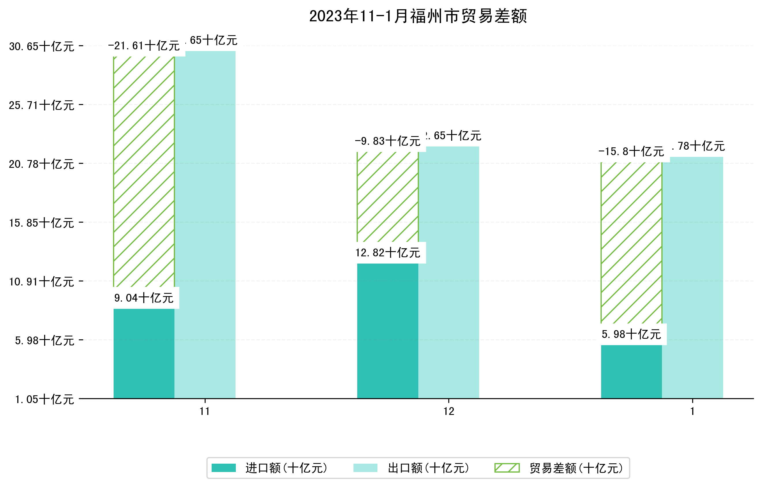 以美元计,2023年1-1月福州市贸易差额为22,6241,4731万美元(贸易顺差),相比上年同期增加了8,8976,0062万美元,同比增加64.82%。