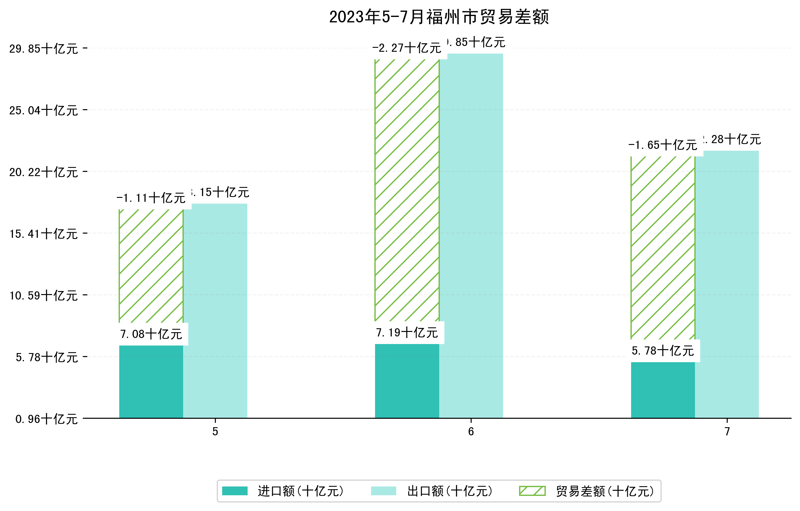 以人民币计,2023年7月福州市贸易差额为165,0456,8623万元(贸易顺差),相比上月减少了61,5842,5654万元,即9,4969,9733万美元;相比上年同期增加了88,0645,2863万元,同比增加114.4%。