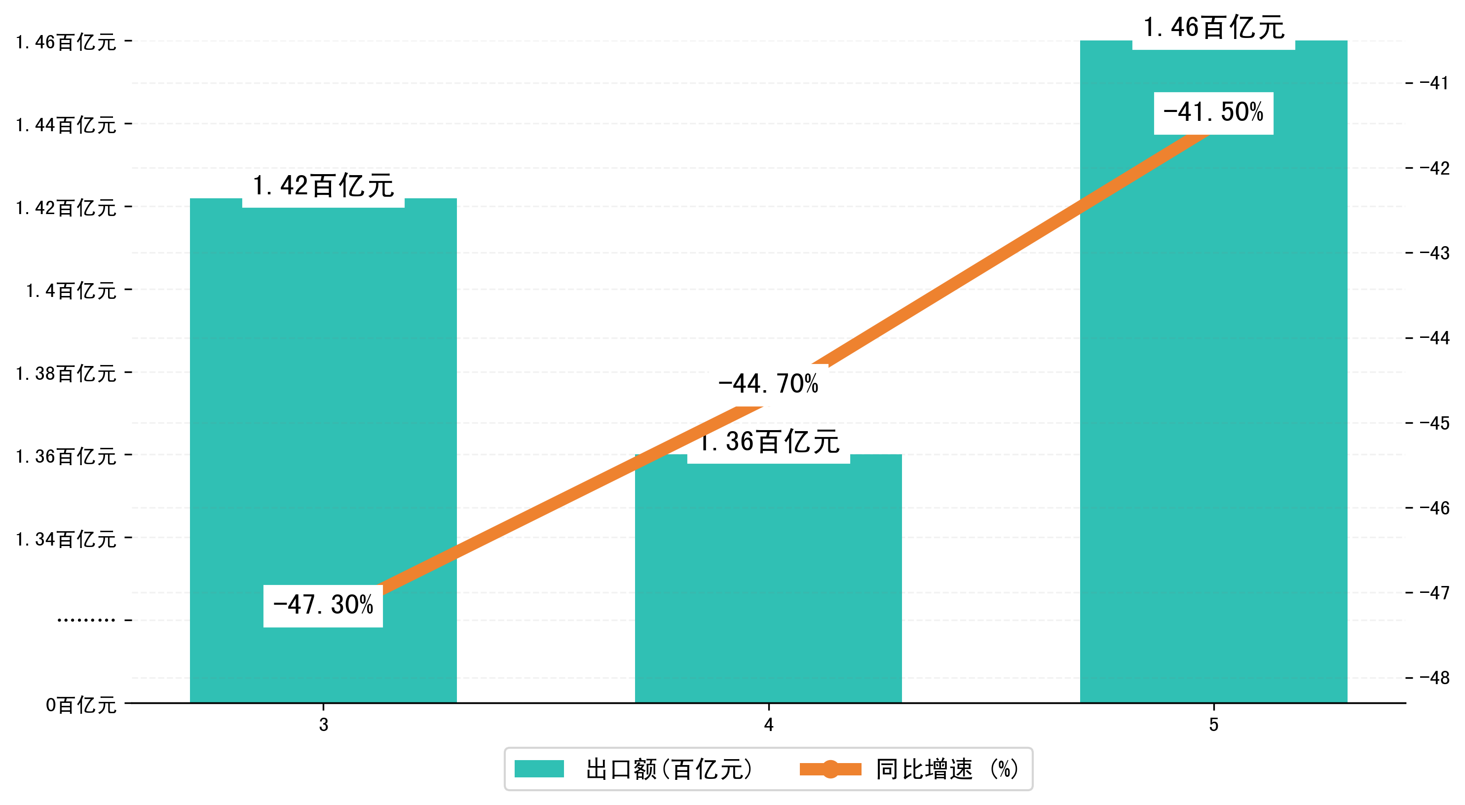 以人民币计,2025年5月福州市出口额为146,1052.6616万元,相比上月增加了10,2311.9737万元;相比上年同期减少了51,0742.6199万元,同比减少了-41.50%。