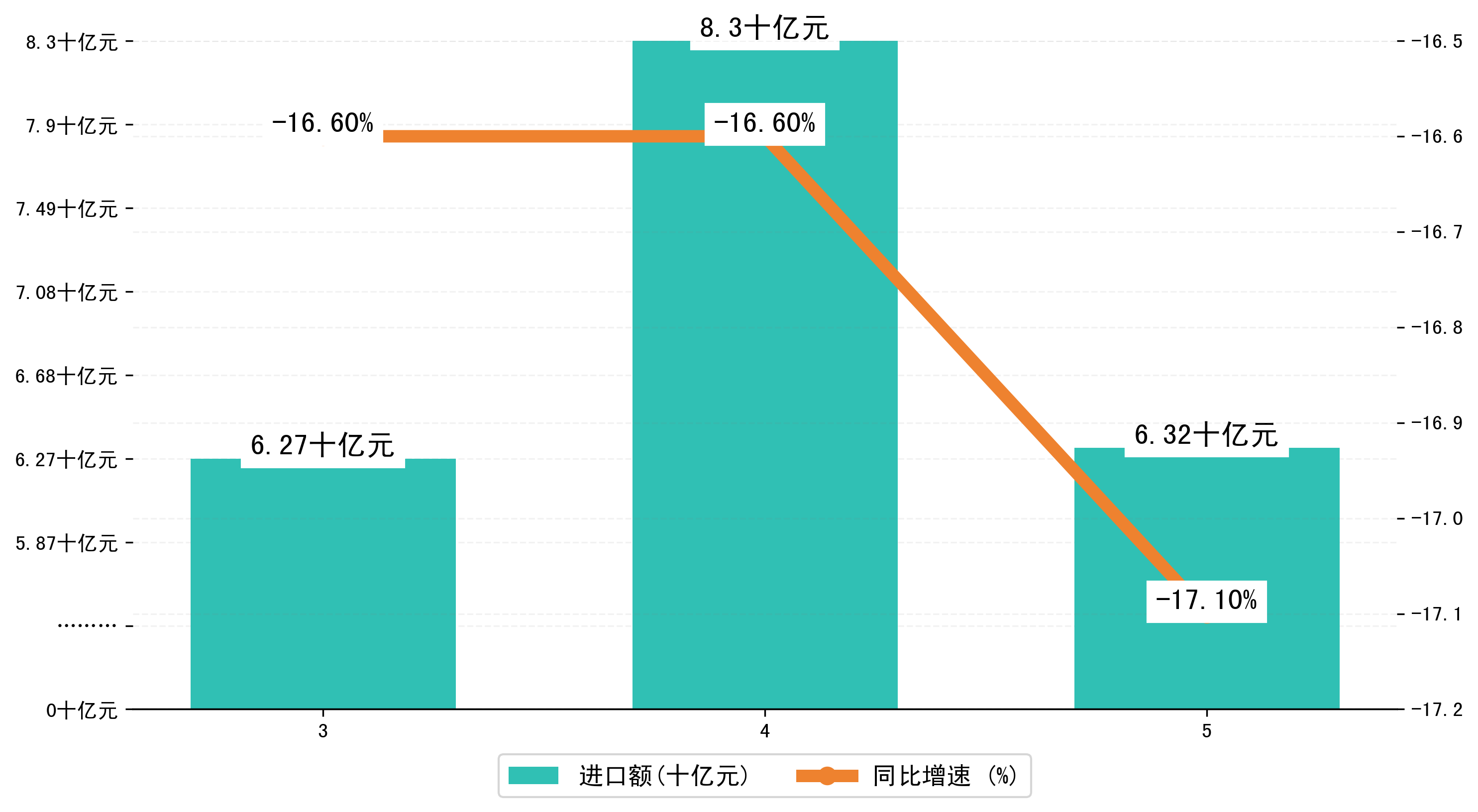 以人民币计,2025年5月福州市进口额为63,2342.6591万元,相比上月减少了19,7889.3292万元;相比上年同期减少了12,8151.8443万元,同比减少了-17.10%。