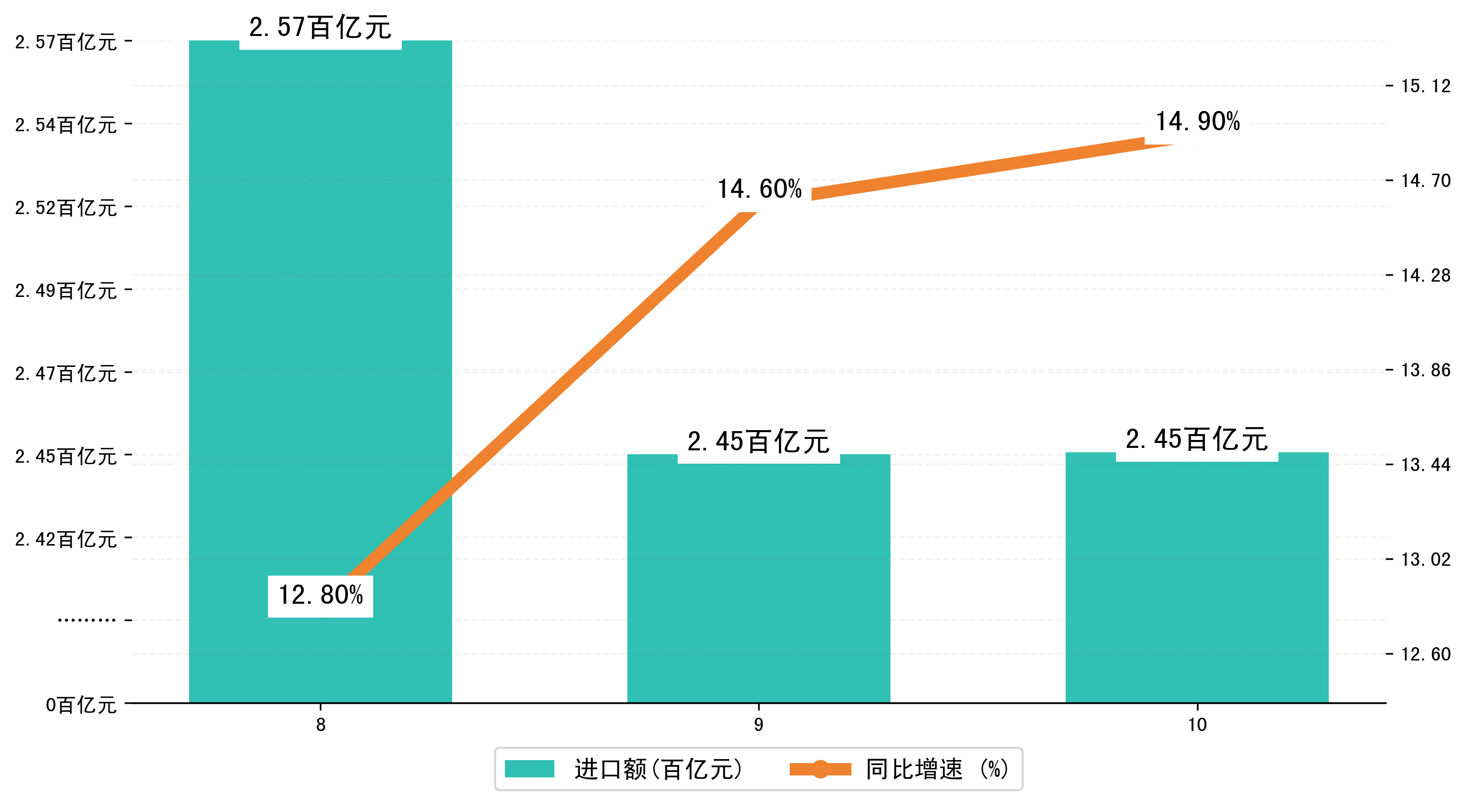 以人民币计,2024年10月无锡市进口额为244,5759.4032万元,相比上月增加了723.6978万元;相比上年同期增加了37,2586.219万元,同比增加了14.90%。
