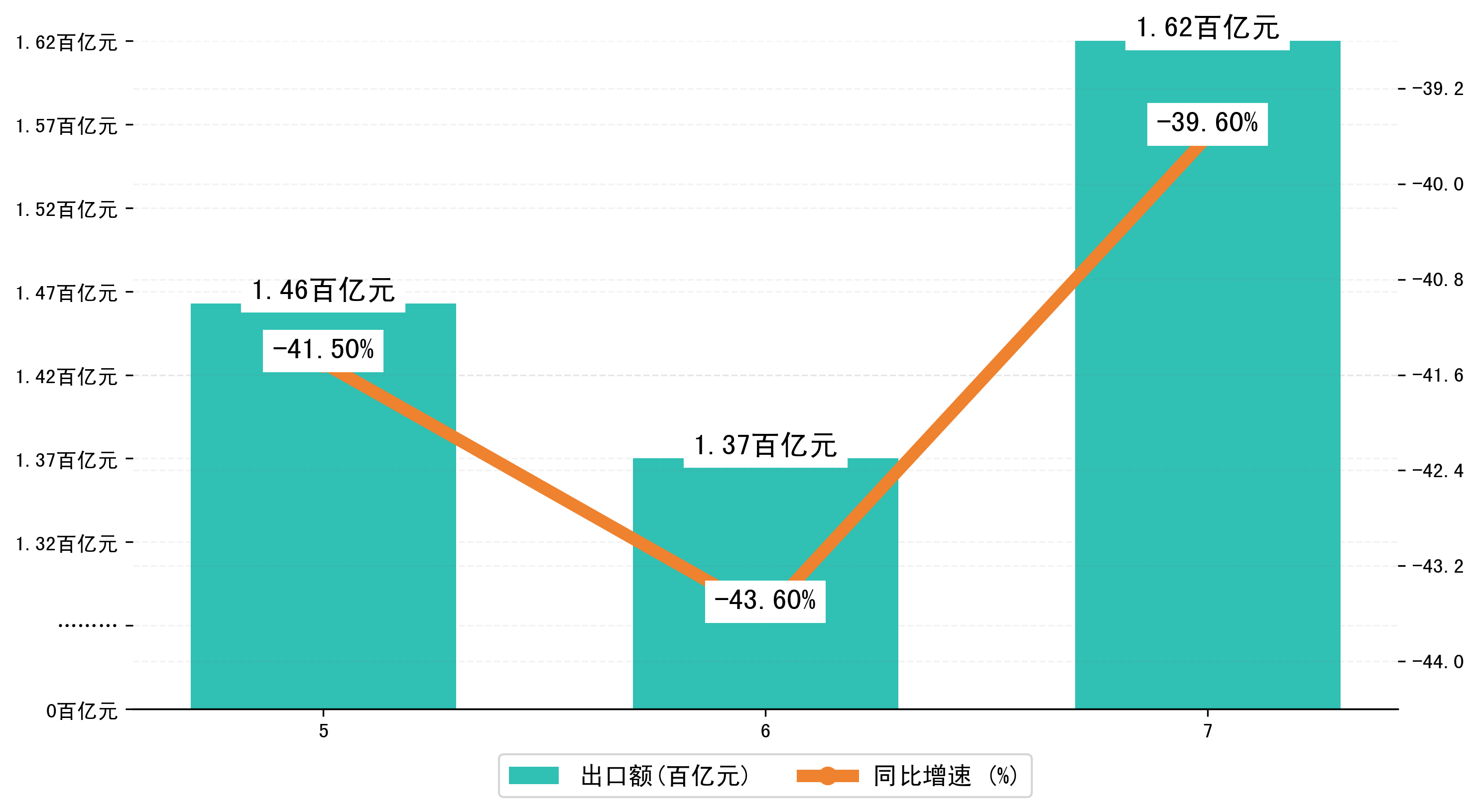 以人民币计,2025年7月福州市出口额为161,5754.9224万元,相比上月增加了24,6121.5499万元;相比上年同期减少了8,7879.4932万元,同比减少了-39.60%。