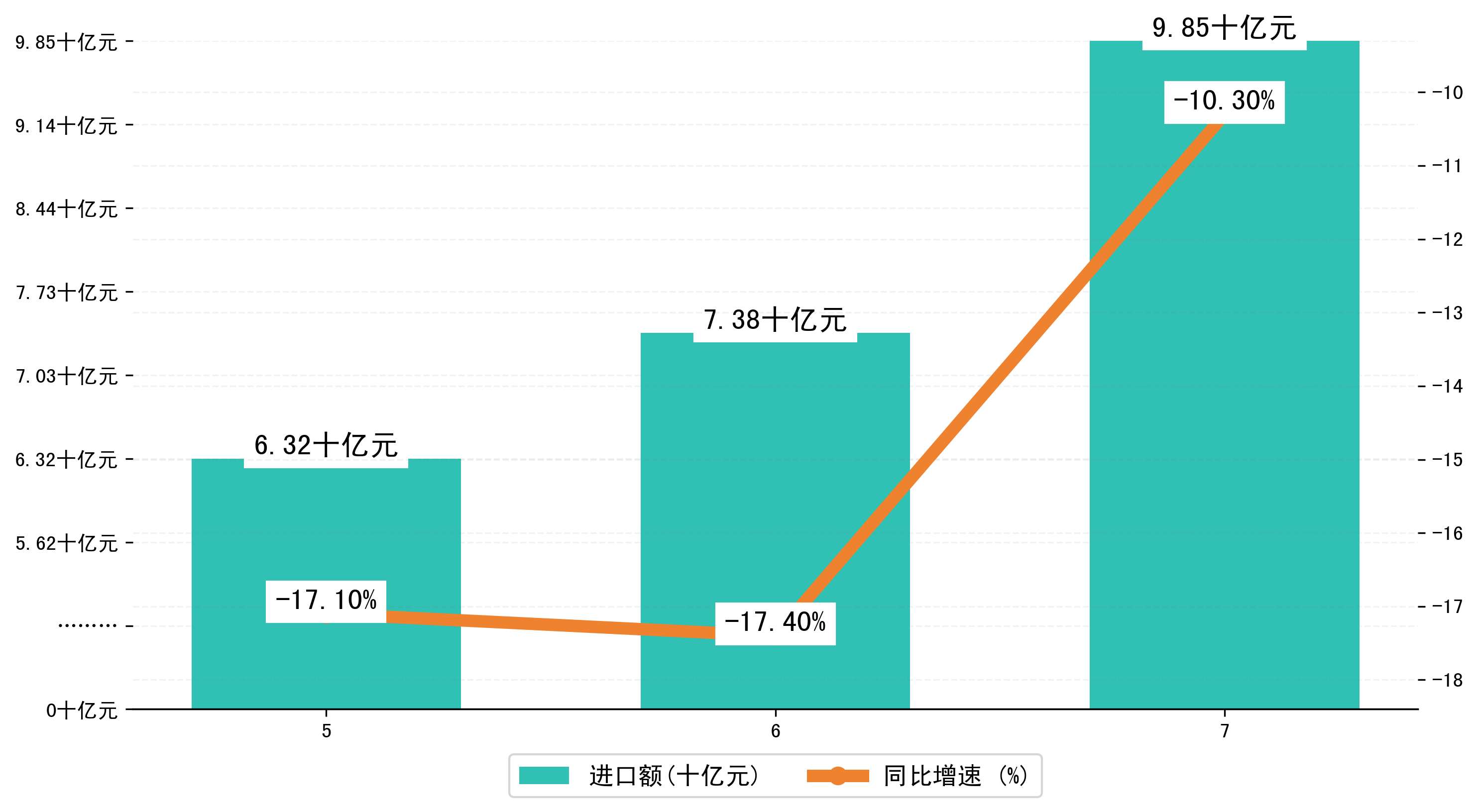以人民币计,2025年7月福州市进口额为98,4735.3296万元,相比上月增加了24,6375.7499万元;相比上年同期增加了24,9859.3695万元,同比减少了-10.30%。
