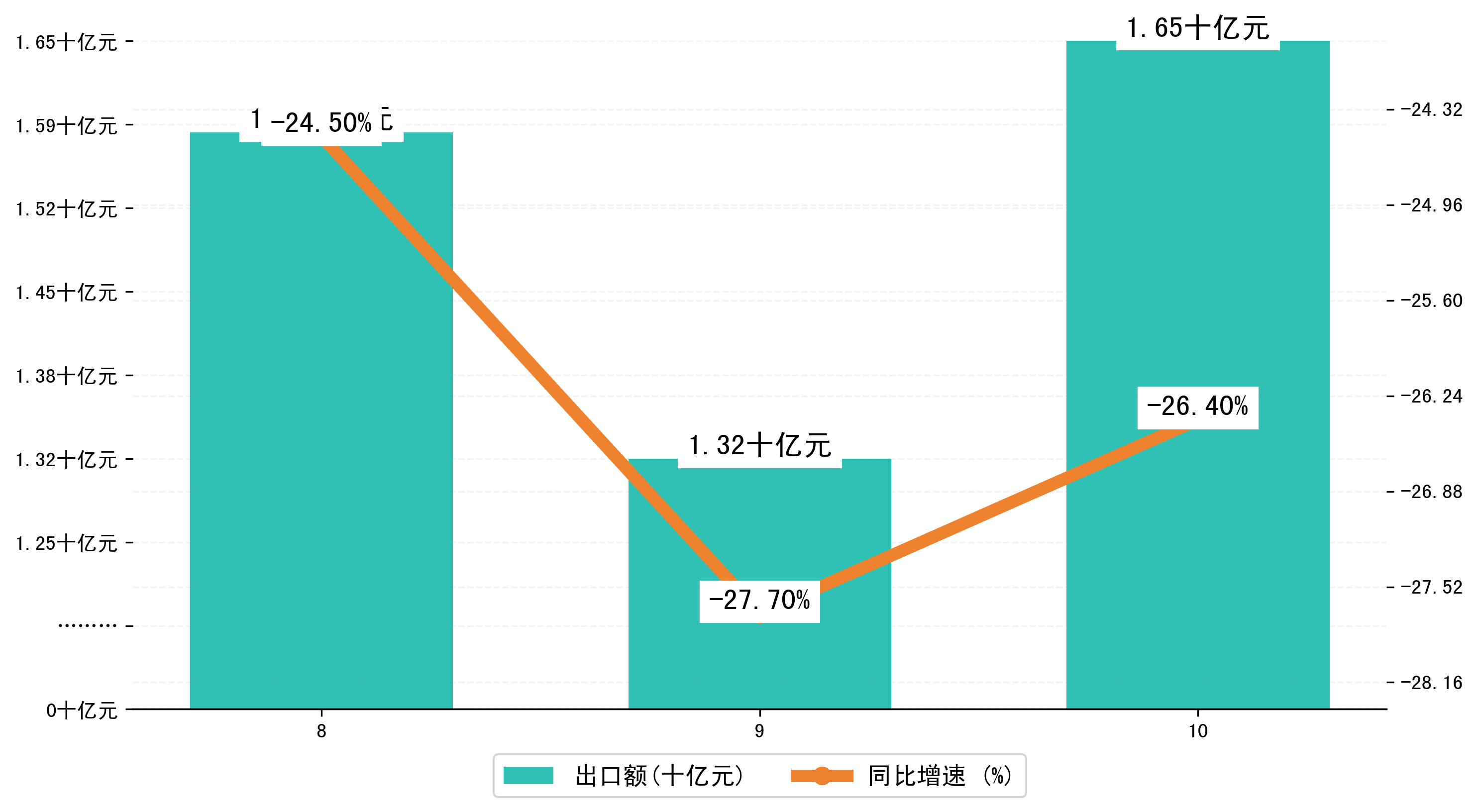 以人民币计,2024年10月抚州市出口额为16,5206.1935万元,相比上月增加了3,3436.4906万元;相比上年同期减少了3,0823.9754万元,同比减少了-26.40%。