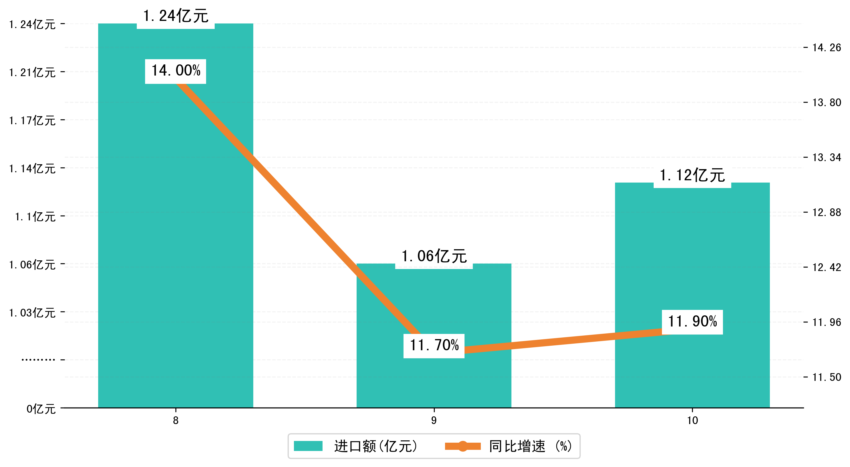 以人民币计,2024年1-10月抚州市进口额为13,9262.8867万元,相比上年同期增加了1,5707.4254万元,同比增加了11.90%。
