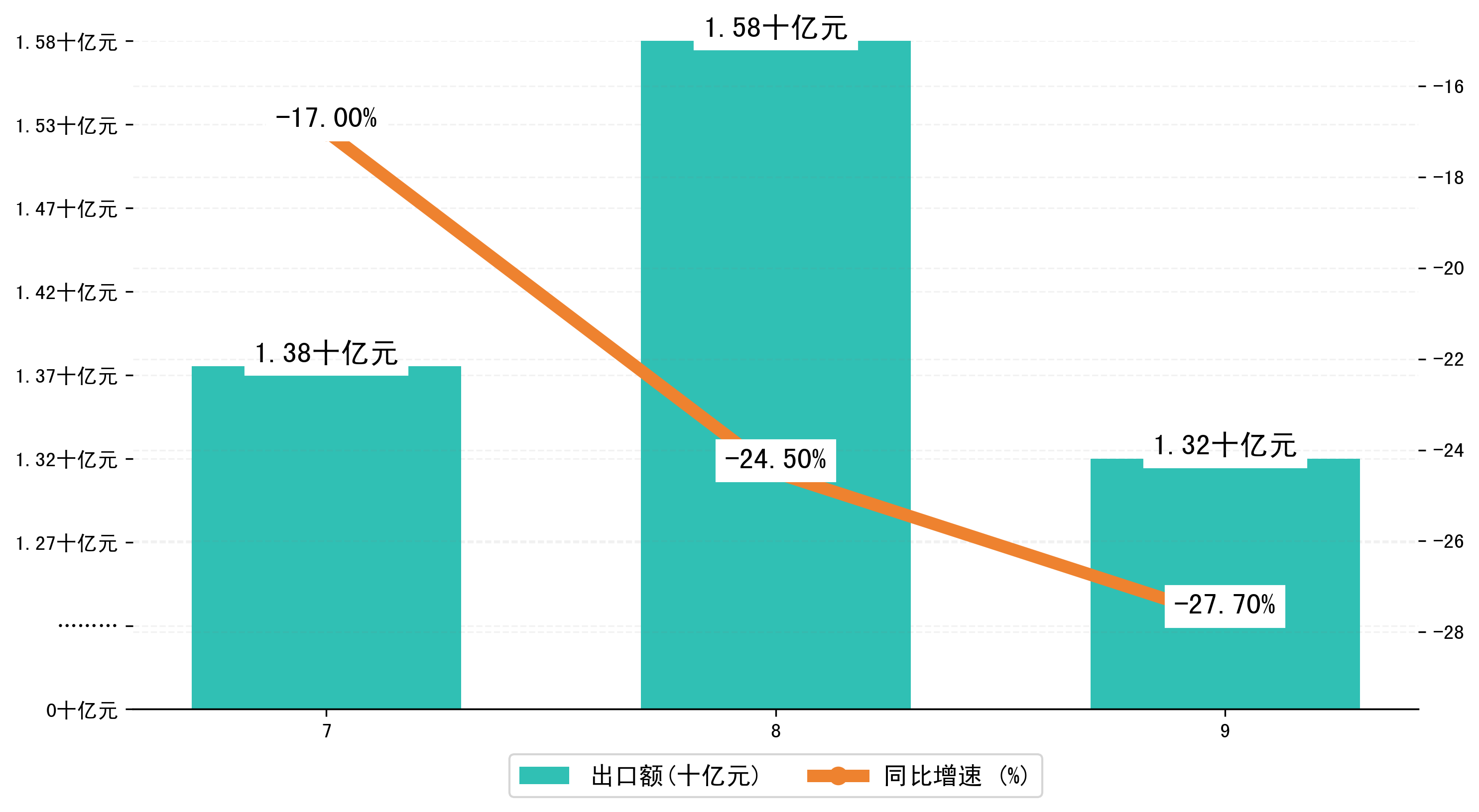 以美元计,2024年1-9月抚州市出口额为17,2086.2093万美元,相比上年同期减少了7,0011.9272万美元,同比减少-28.90%。