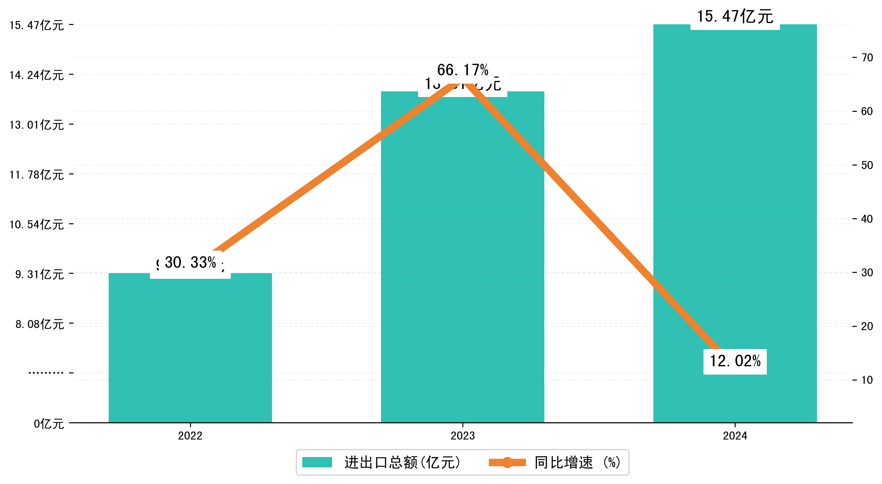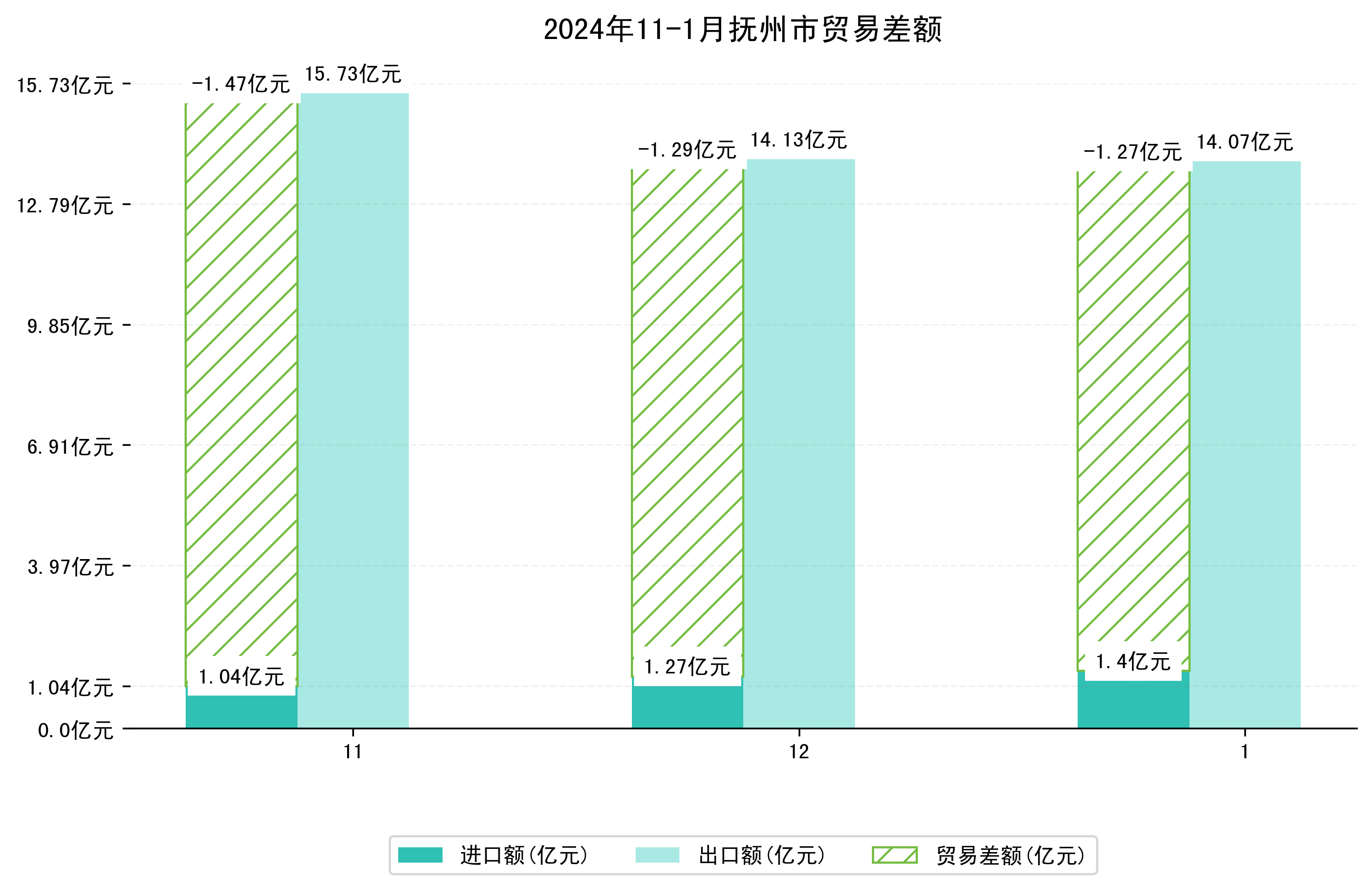 以人民币计,2024年1-1月抚州市进出口总额为15,4731.5793万元,相比上年同期增加了1,6604.6515万元,同比增加了27.40%。