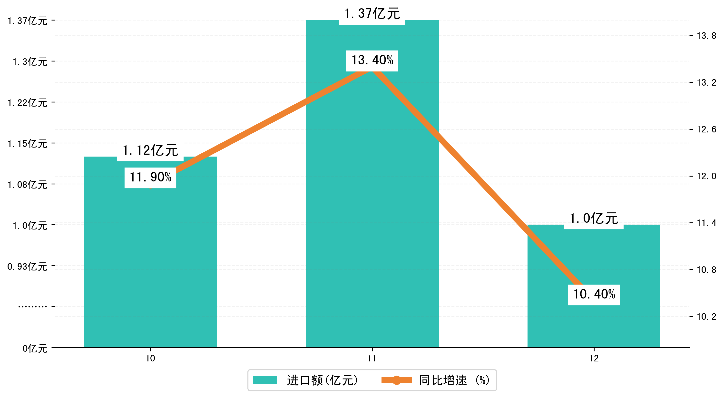 以人民币计,2024年12月抚州市进口额为1,0023.5492万元,相比上月减少了3664.5982万元;相比上年同期减少了2681.1354万元,同比增加了10.40%。