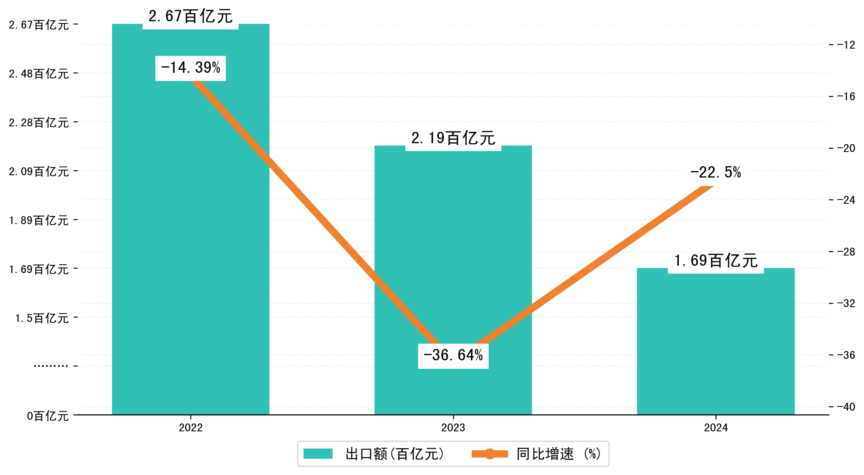 以人民币计,2024年1-12月抚州市出口额为169,3899.9047万元,相比上年同期减少了49,1783.7882万元,同比减少了-22.50%。