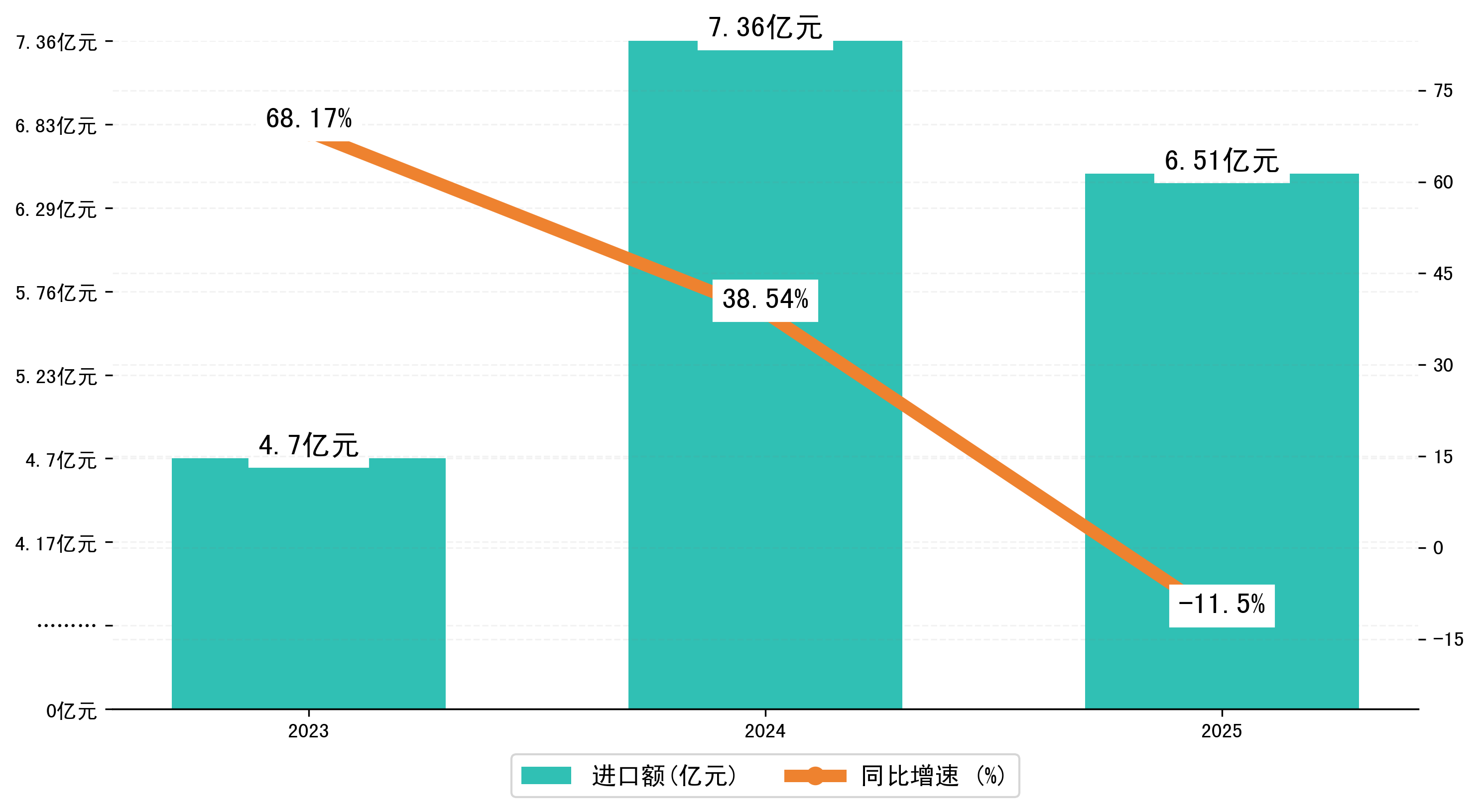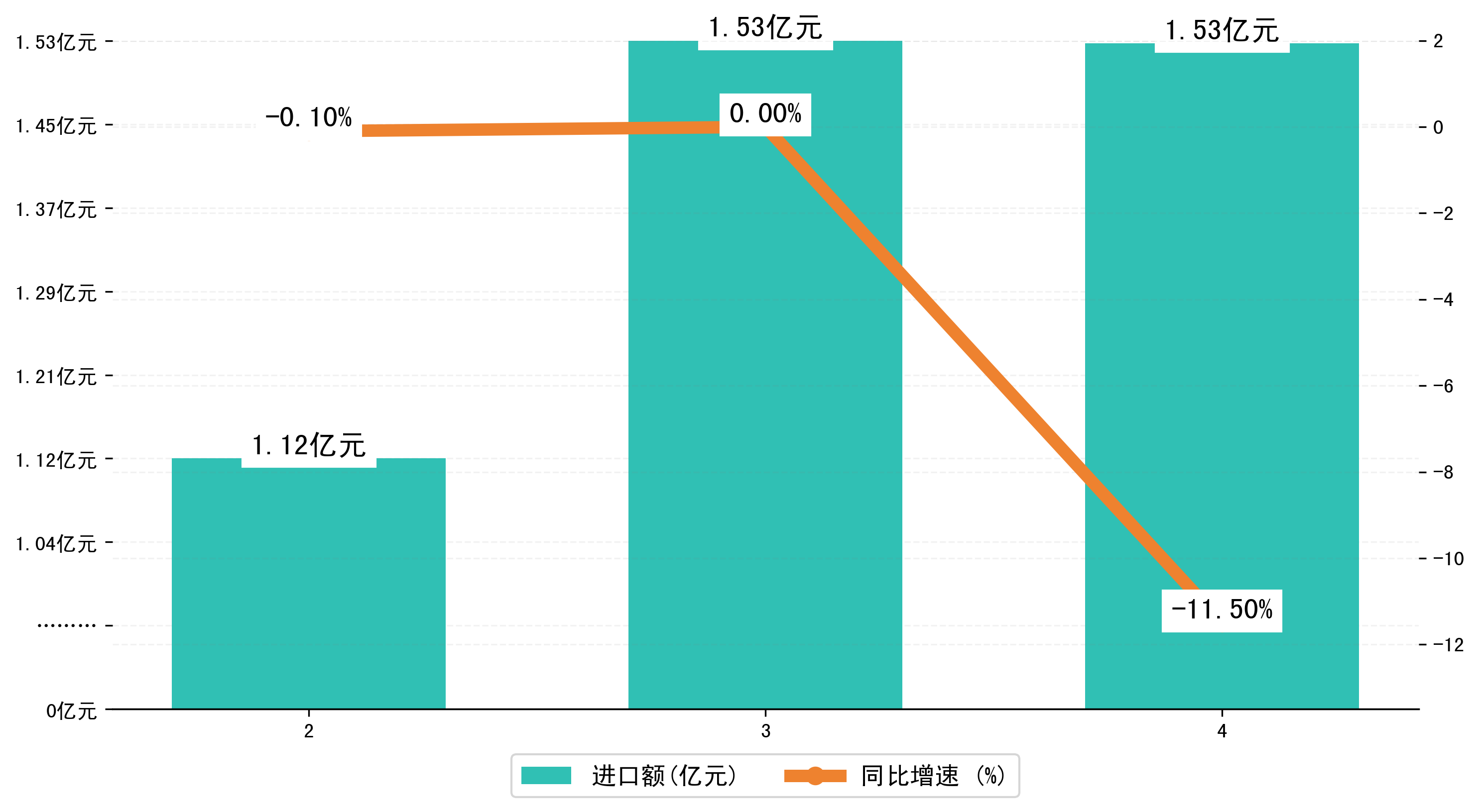 以人民币计,2025年1-4月抚州市进口额为6,5118.265万元,相比上年同期减少了8459.054万元,同比减少了-11.50%。
