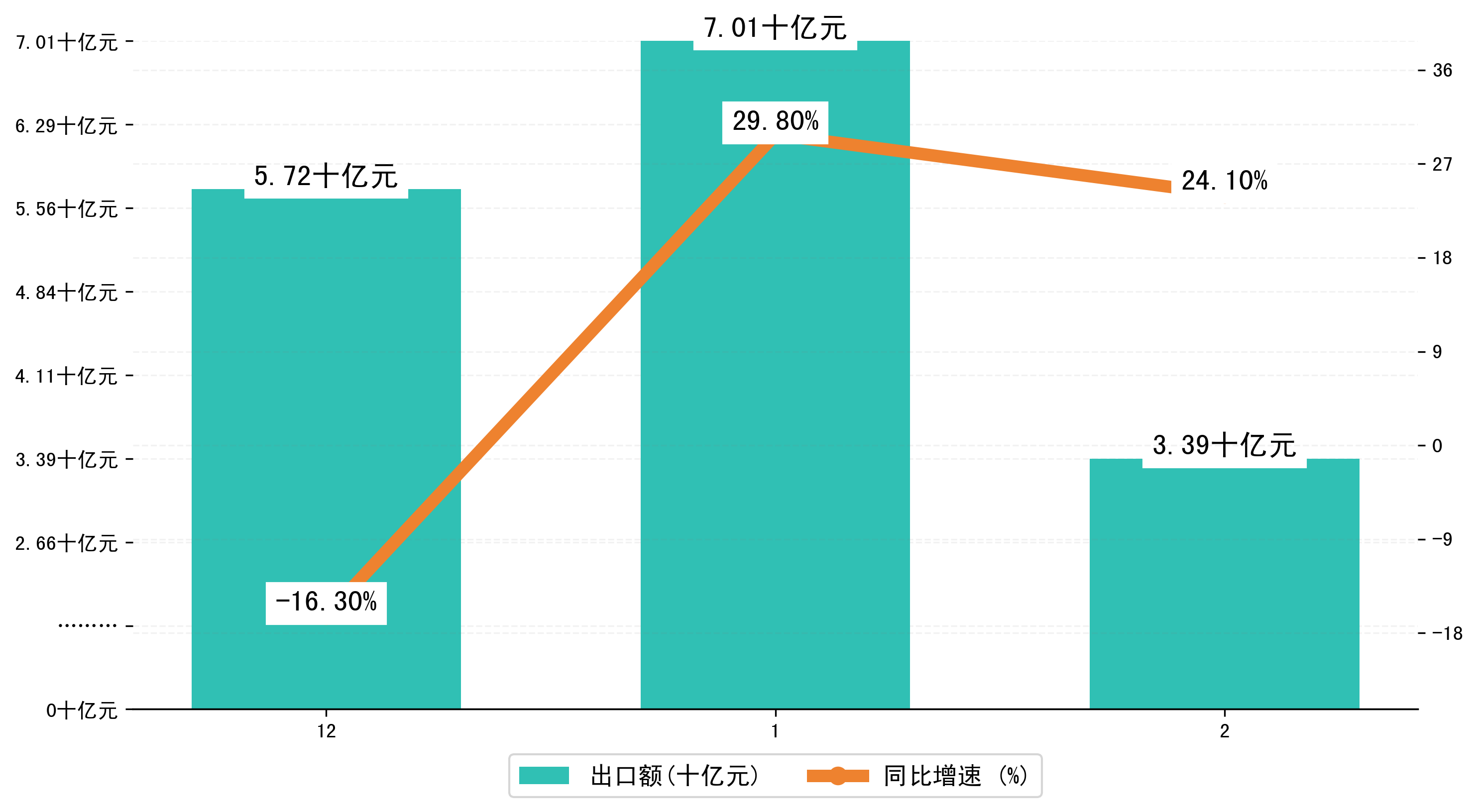 以美元计,2024年2月赣州市出口额为4,7647.3582万美元,相比上月减少了5,1106.8086万美元;相比上年同期减少了9528.7088万美元,同比增加20.60%。