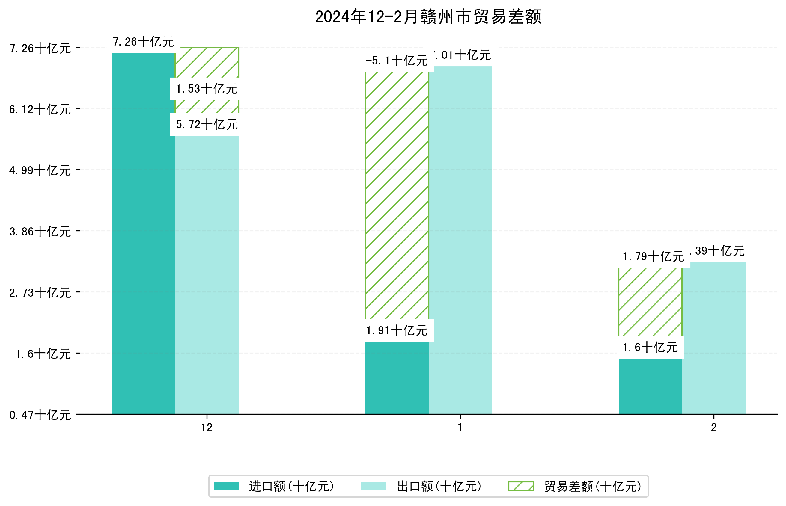 以人民币计,2024年1-2月赣州市贸易差额为68,9124,5997万元(贸易顺差),相比上年同期减少了13,4831,3215万元,同比减少-16.36%。