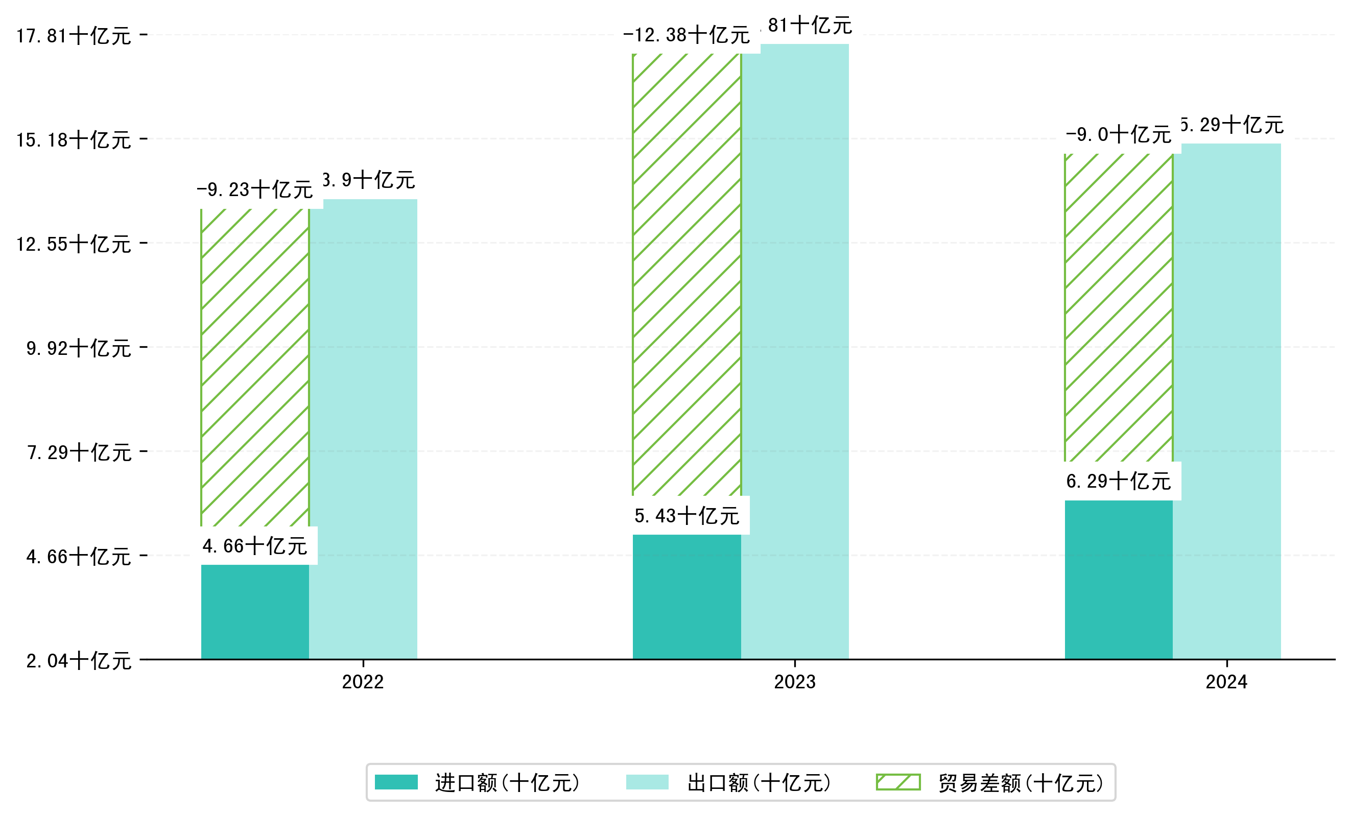 以人民币计,2024年3月赣州市贸易差额为21,1102,0779万元(贸易顺差),相比上月增加了3,2237,3440万元,即4574,2949万美元;相比上年同期减少了20,3659,3493万元,同比减少-49.1%。