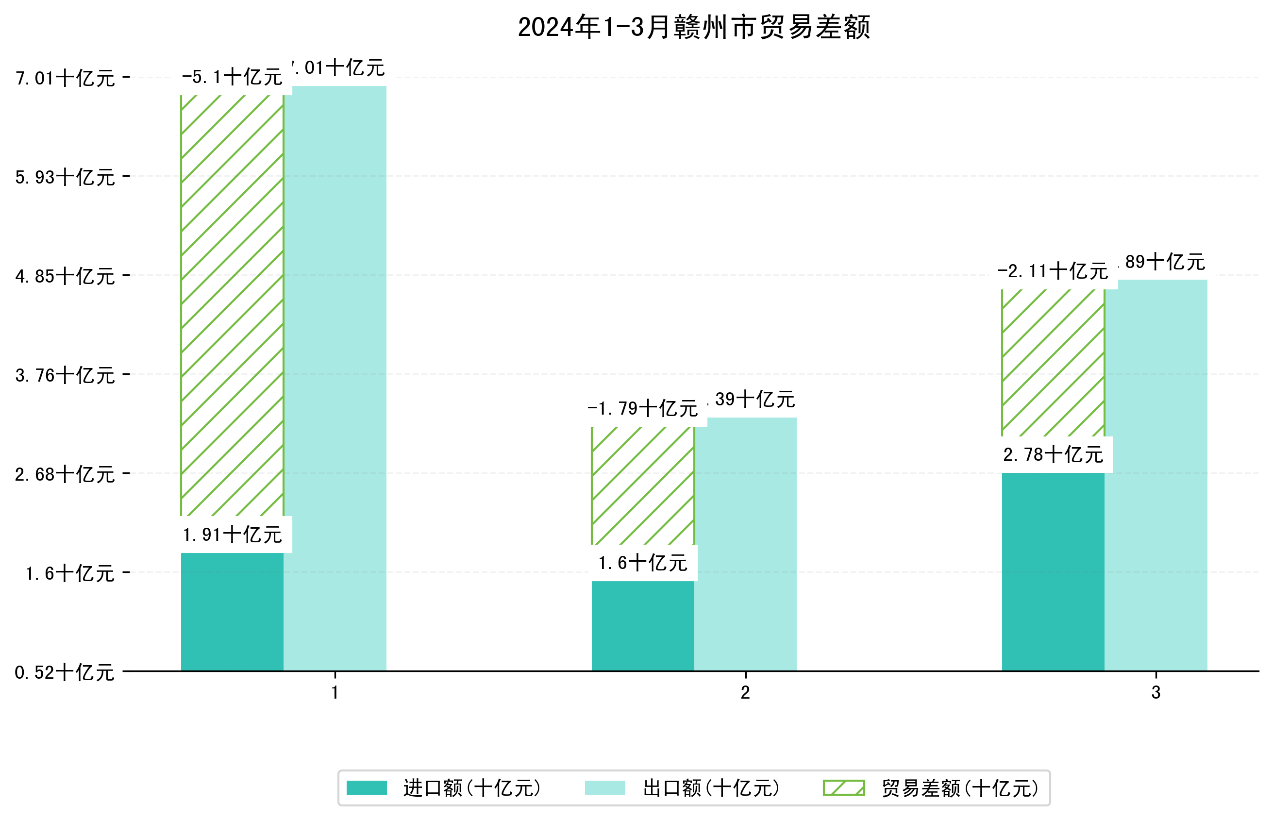 以人民币计,2024年1-3月赣州市贸易差额为90,0186,7898万元(贸易顺差),相比上年同期减少了33,8223,0563万元,同比减少-27.31%。