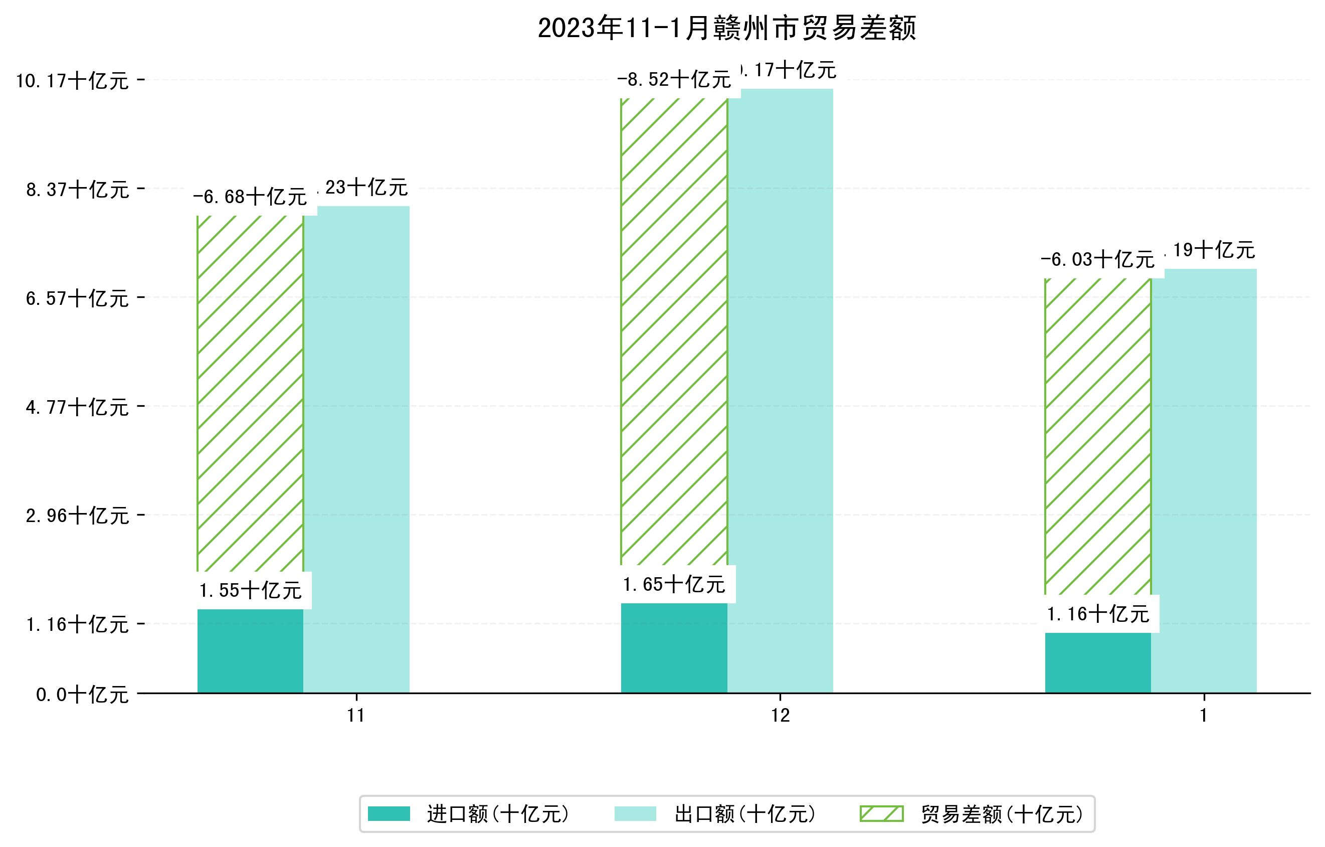 以人民币计,2023年1-1月赣州市贸易差额为60,3248,4270万元(贸易顺差),相比上年同期增加了25,8903,5887万元,同比增加75.19%。