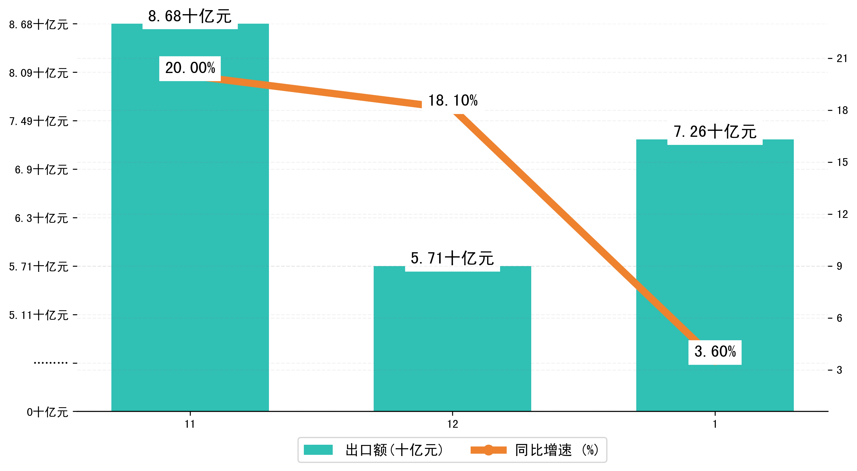 以人民币计,2025年1-1月赣州市出口额为72,6472.6216万元,相比上年同期增加了2,5185.9729万元,同比增加了3.60%。
