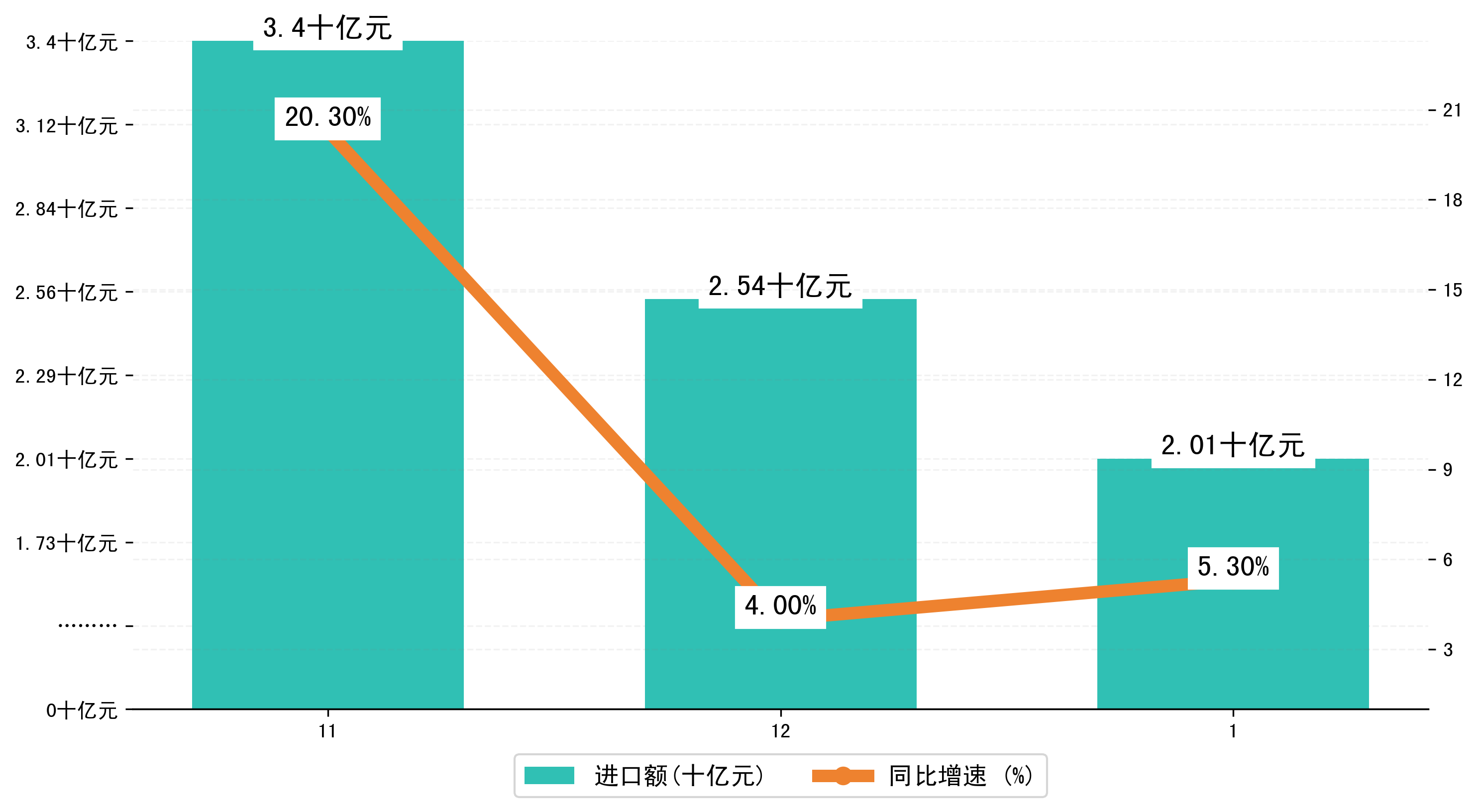 以美元计,2025年1-1月赣州市进口额为2,7963.3495万美元,相比上年同期增加了1051.1583万美元,同比增加3.90%。