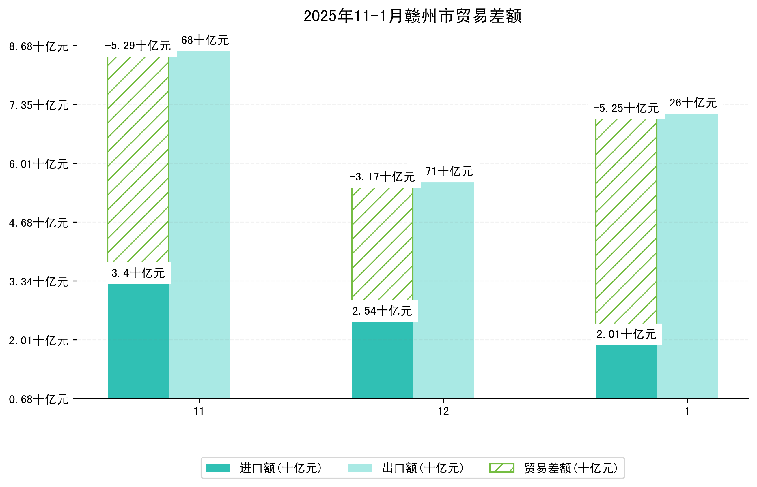 以人民币计,2025年1-1月赣州市贸易差额为52,5462,3658万元(贸易顺差),相比上年同期增加了1,5202,5000万元,同比增加2.98%。