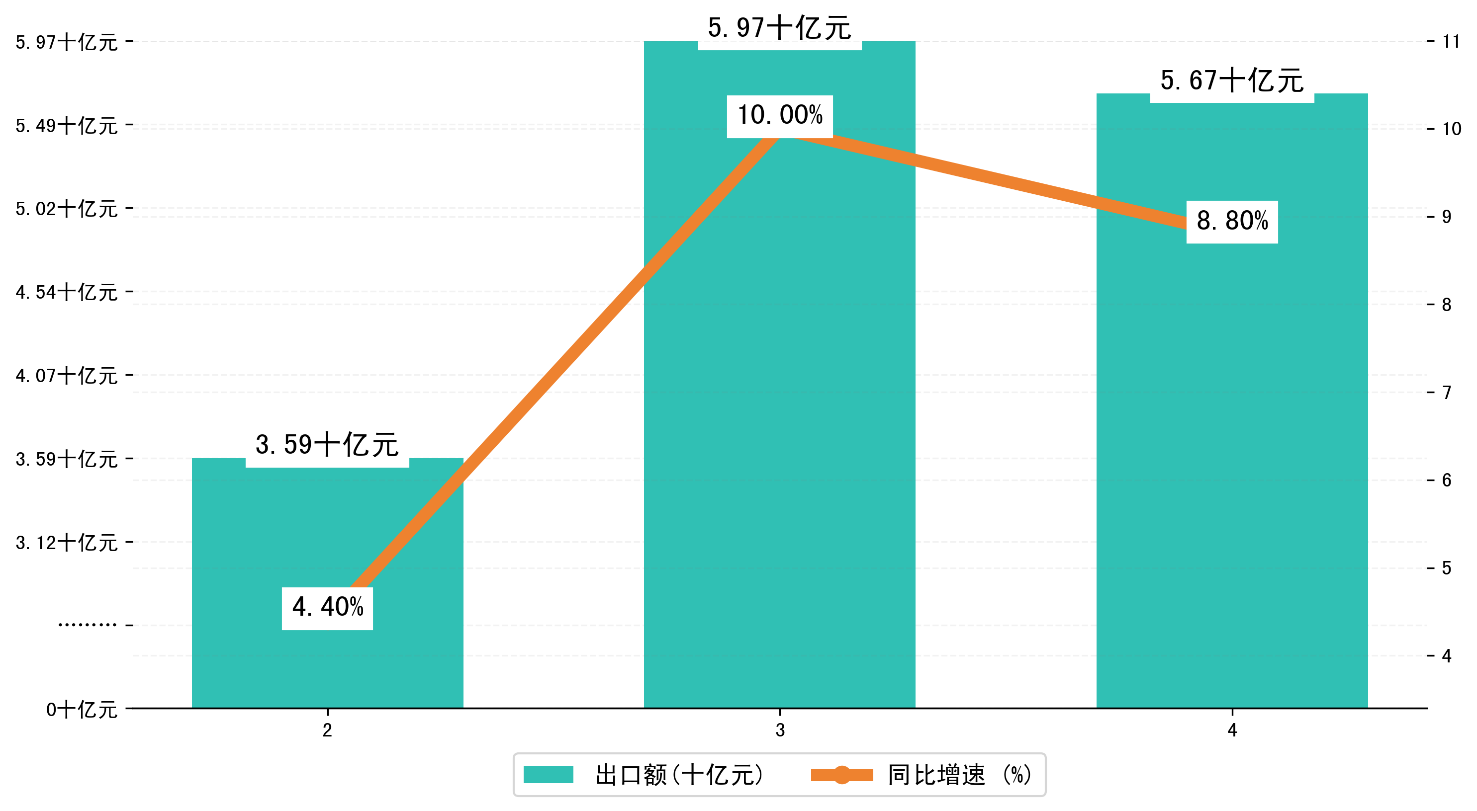 以人民币计,2025年1-4月赣州市出口额为224,8875.4526万元,相比上年同期增加了18,2737.9103万元,同比增加了8.80%。