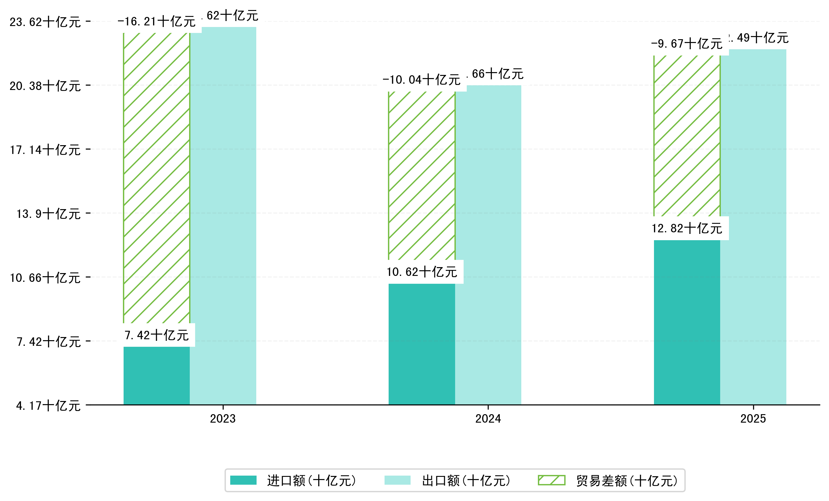 以人民币计,2025年1-4月赣州市贸易差额为96,6767,8707万元(贸易顺差),相比上年同期减少了3,7688,5861万元,同比减少-3.75%。