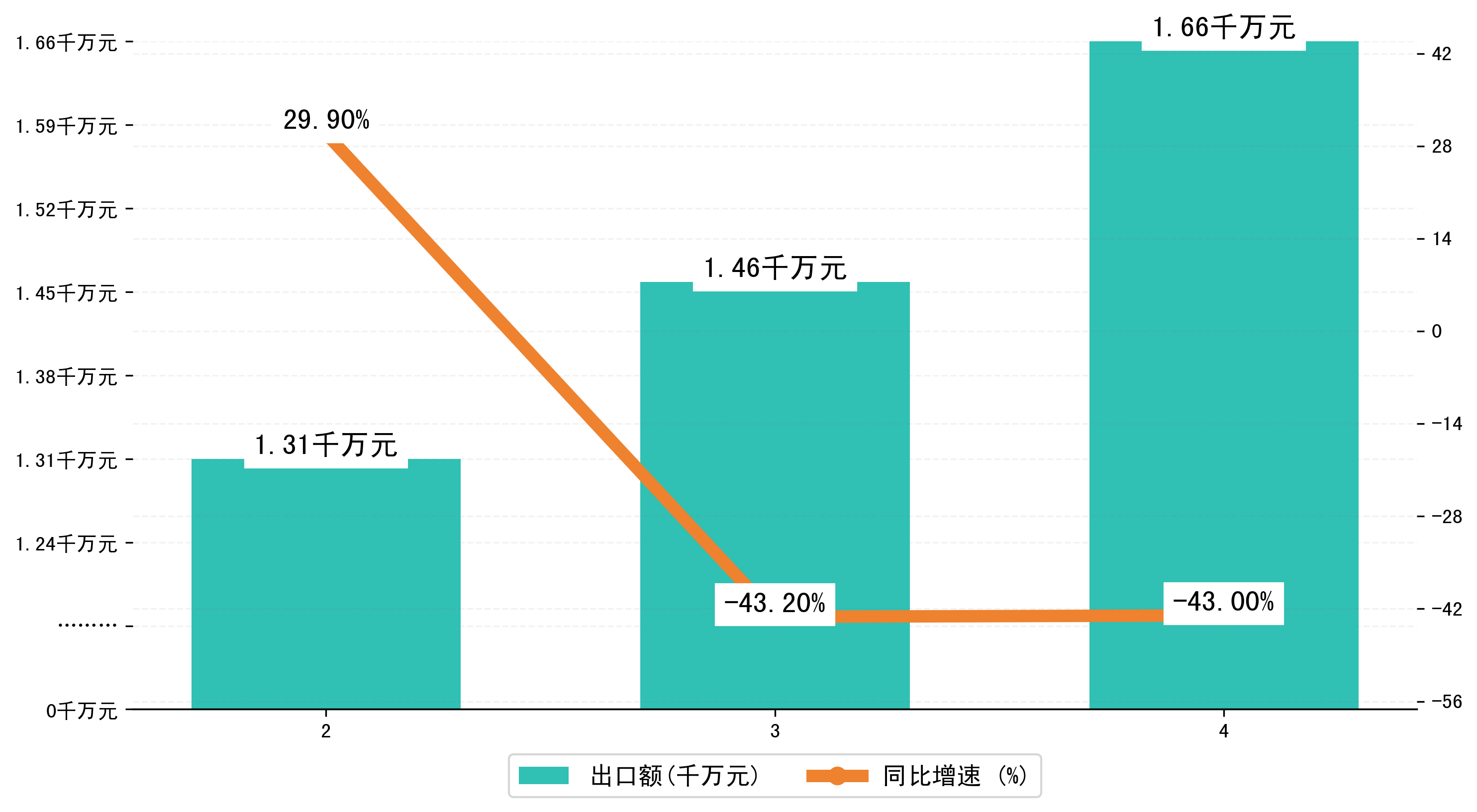 以人民币计,2024年4月广元市出口额为1658.9999万元,相比上月增加了202.6999万元;相比上年同期减少了1215.5811万元,同比减少了-43.00%。