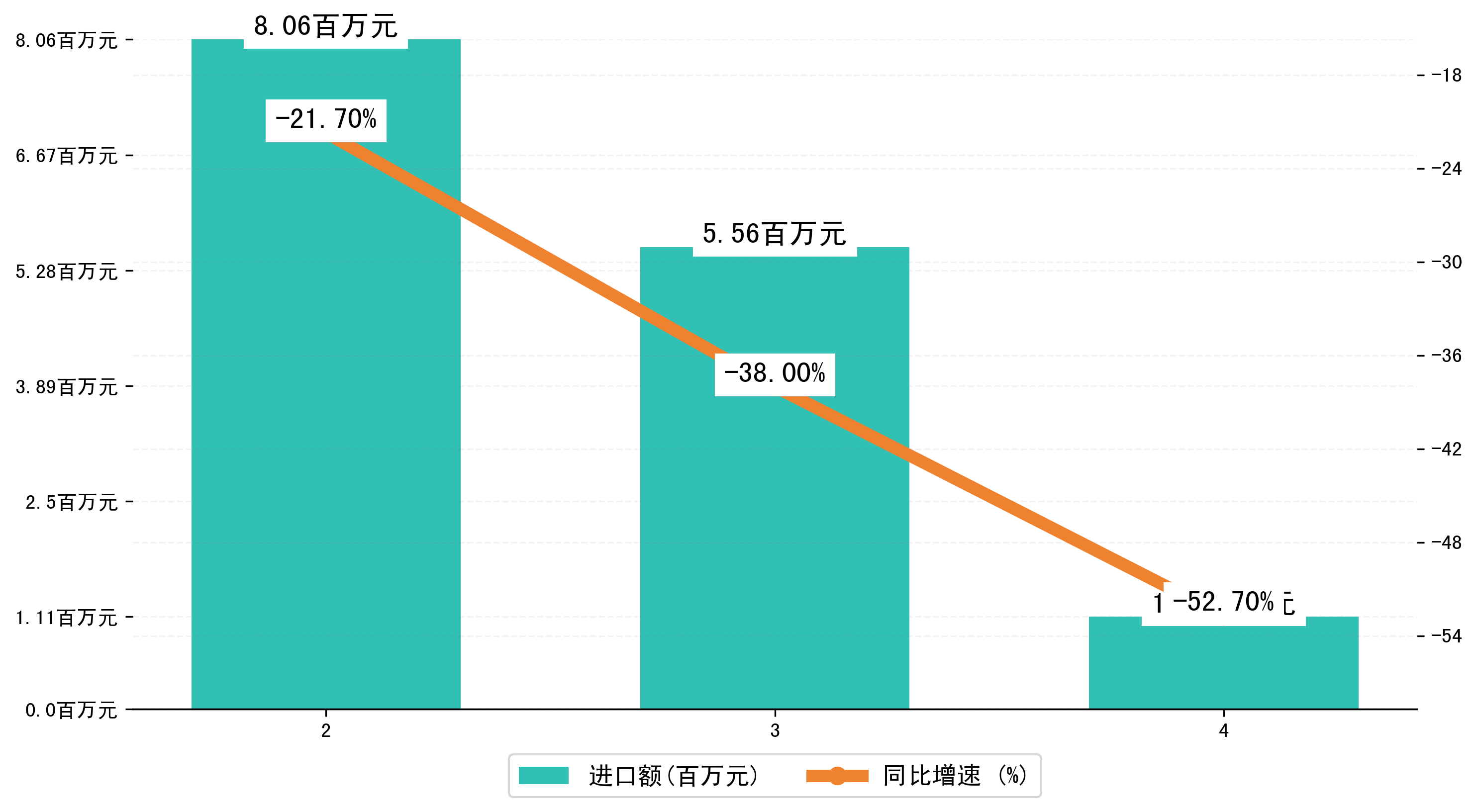 以美元计,2024年4月广元市进口额为15.6339万美元,相比上月减少了62.8634万美元;相比上年同期减少了119.04万美元,同比减少-54.60%。