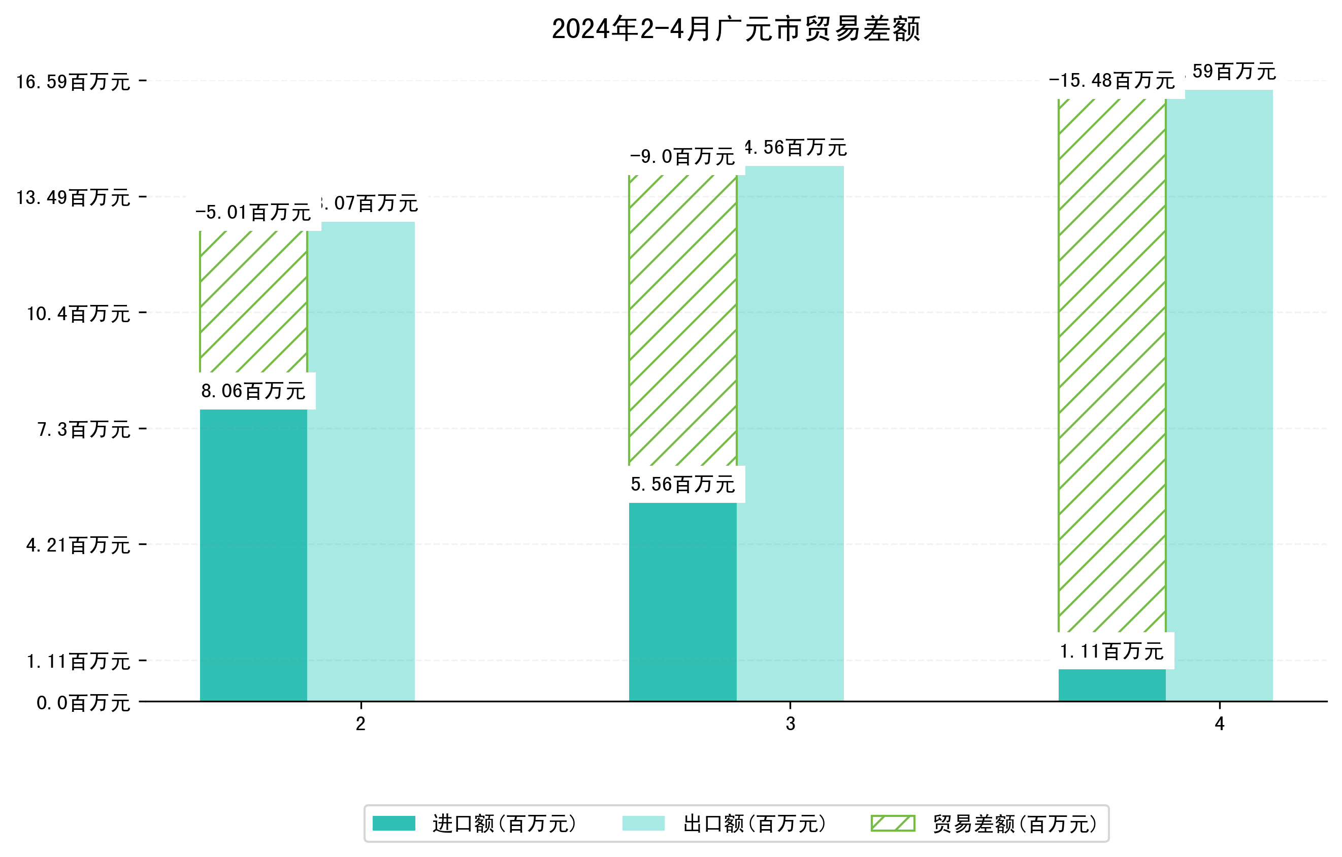 以人民币计,2024年1-4月广元市贸易差额为5917,4153万元(贸易顺差),相比上年同期减少了3916,7351万元,同比减少-39.83%。