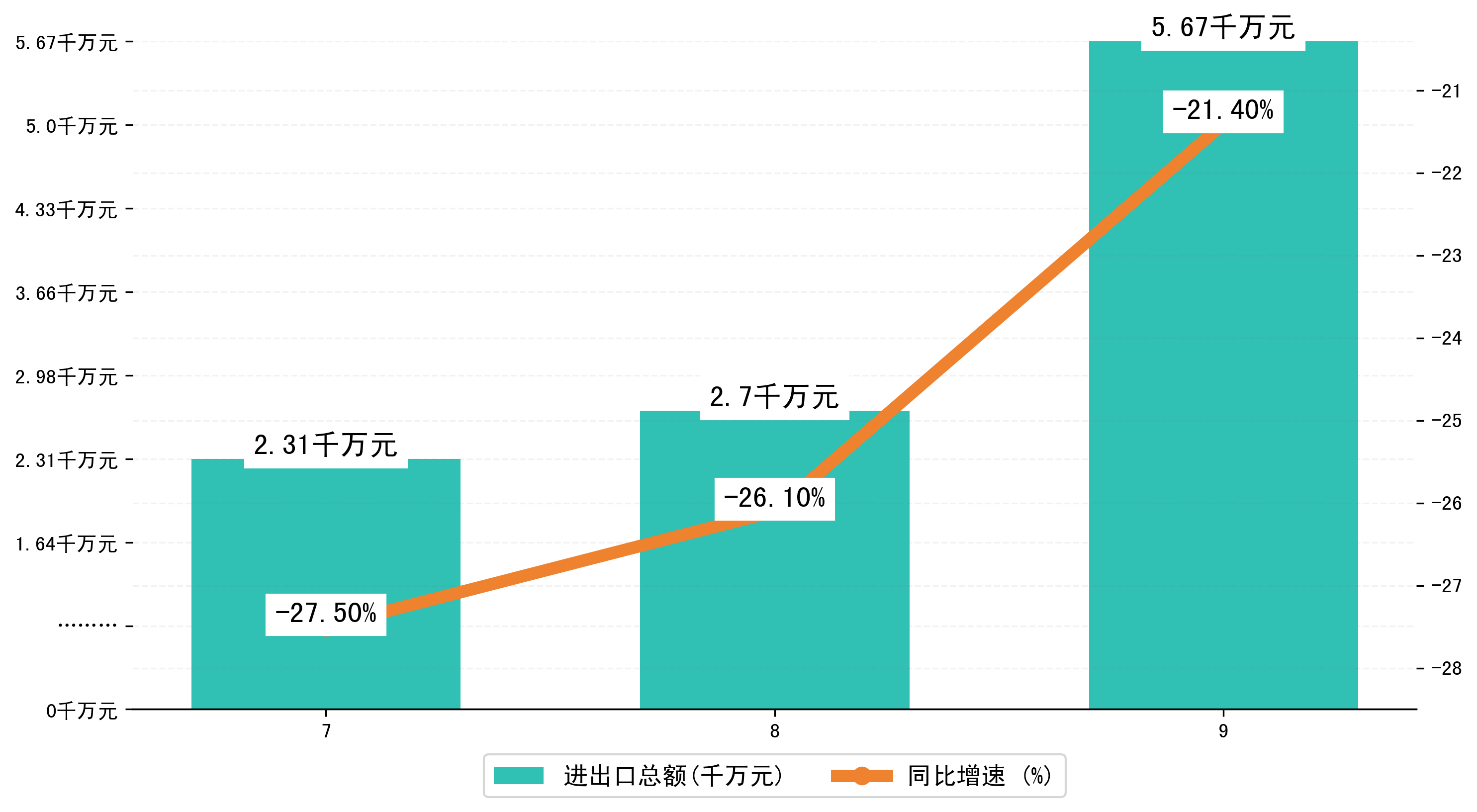 以人民币计,2024年9月广元市进出口总额为5670.1908万元,相比上月增加了2972.2668万元;相比上年同期增加了1723.4949万元,同比减少了-21.40%。