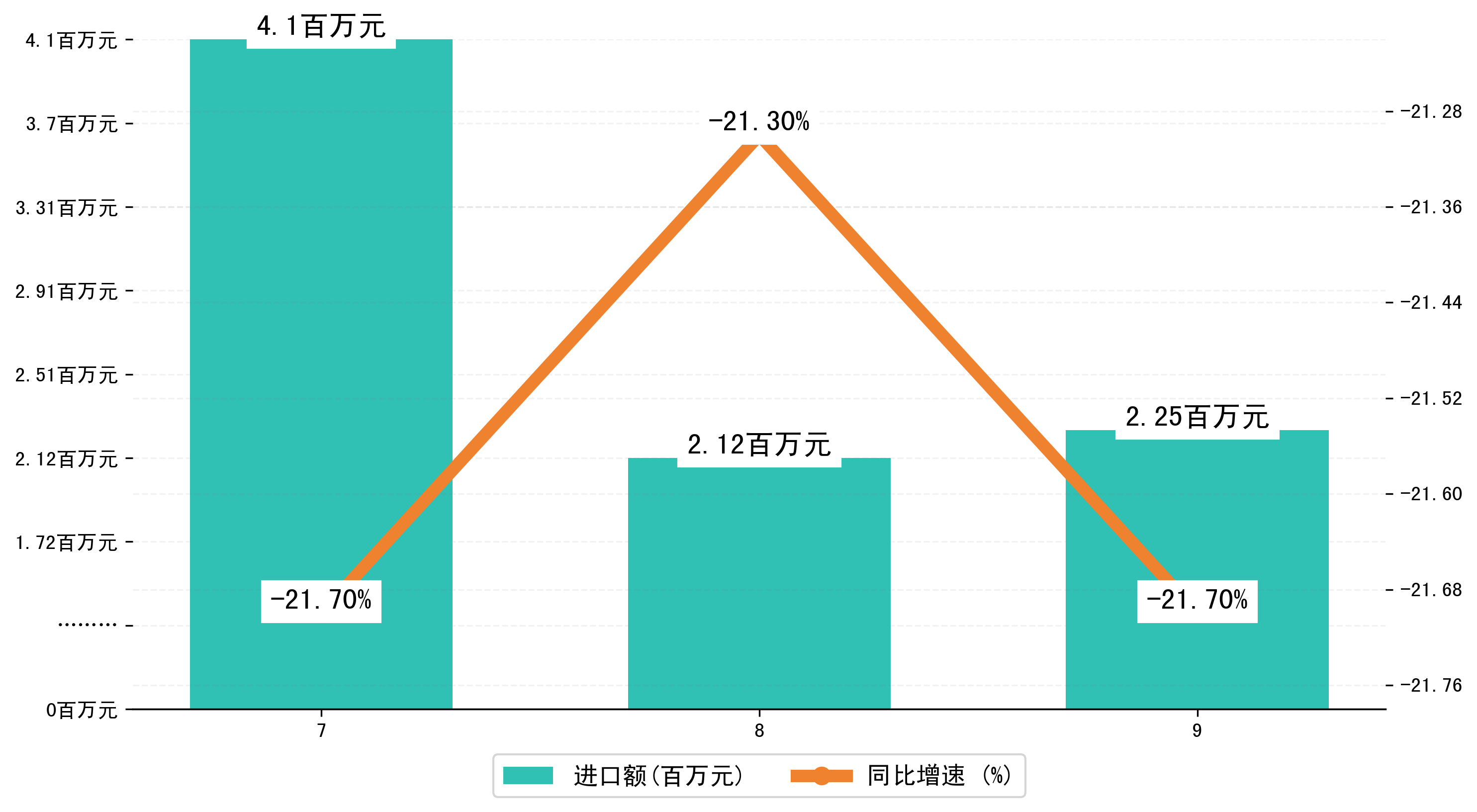 以人民币计,2024年9月广元市进口额为224.9122万元,相比上月增加了13.2508万元;相比上年同期减少了257.2444万元,同比减少了-21.70%。