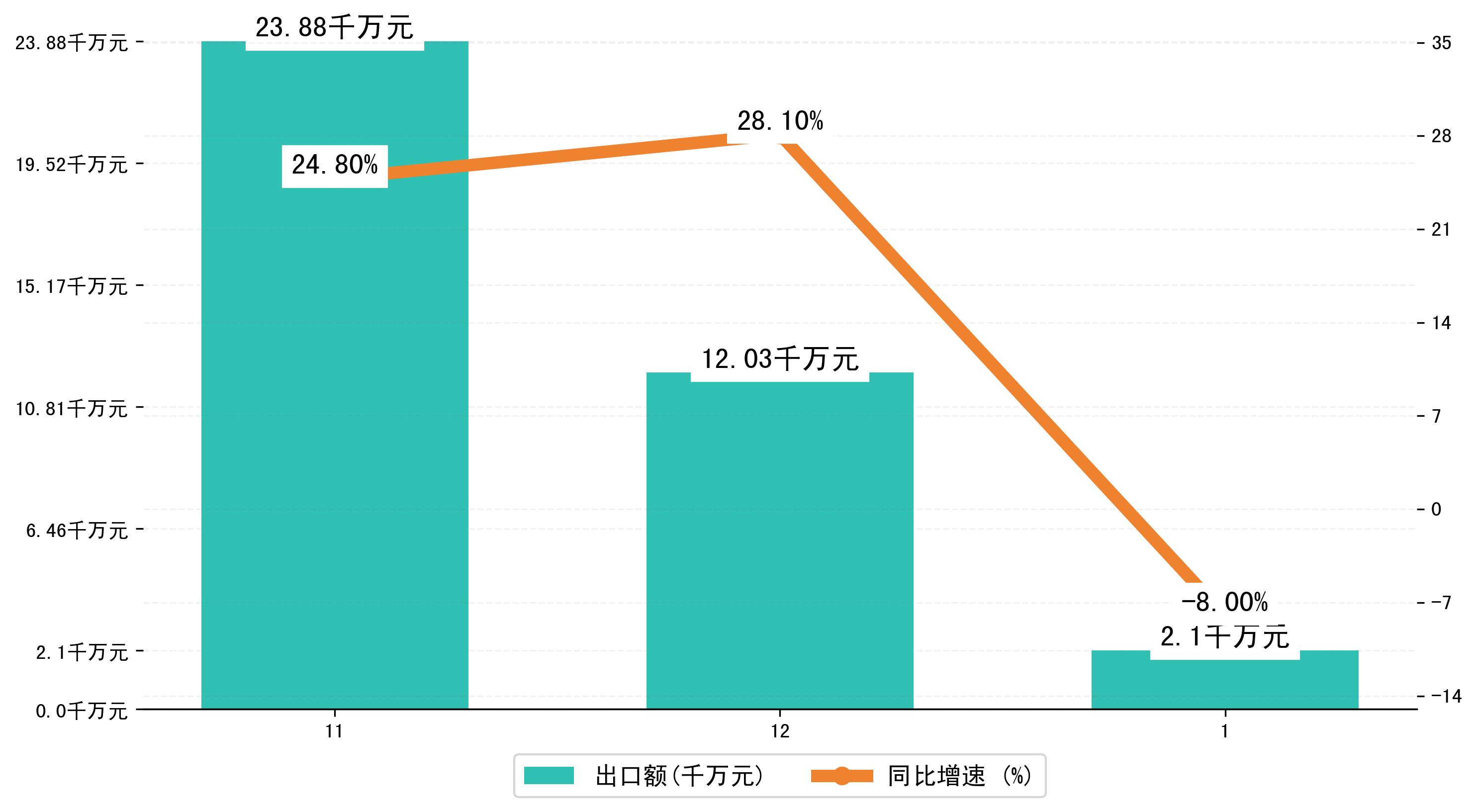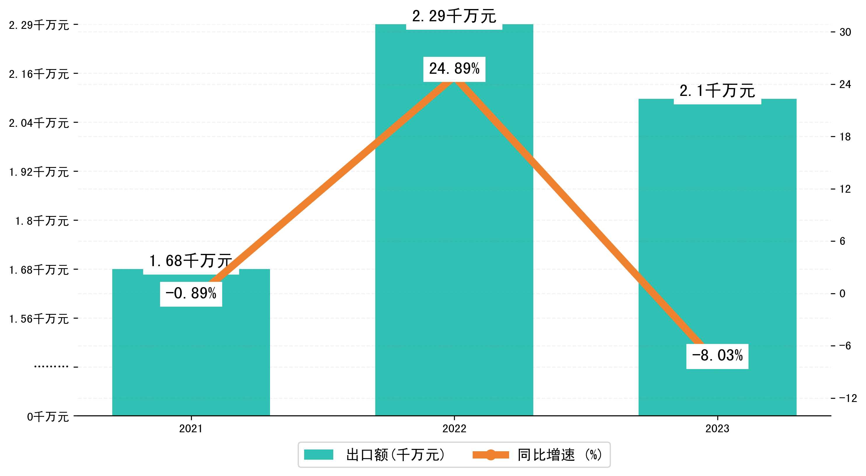 以人民币计,2023年1-1月广元市出口额为2101.6393万元,相比上年同期减少了183.6009万元,同比减少了-8.00%。