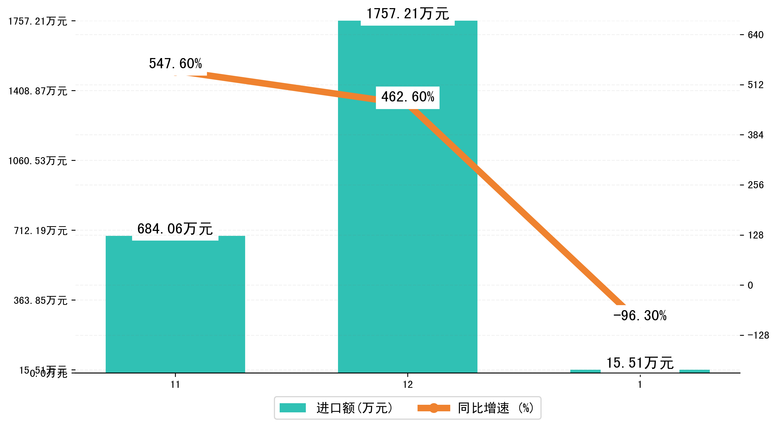以人民币计,2023年1-1月广元市进口额为15.5091万元,相比上年同期减少了402.9438万元,同比减少了-96.30%。