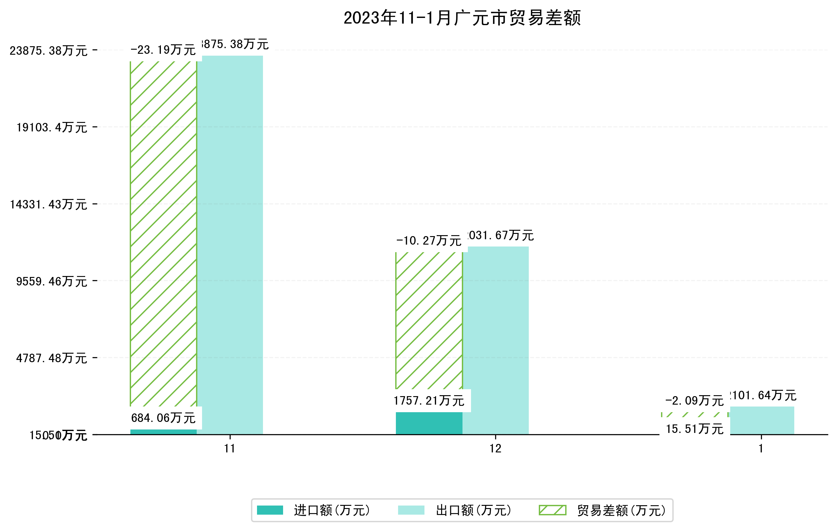 以美元计,2023年1-1月广元市贸易差额为298,0511万美元(贸易顺差),相比上年同期增加了4,9931万美元,同比增加1.7%。