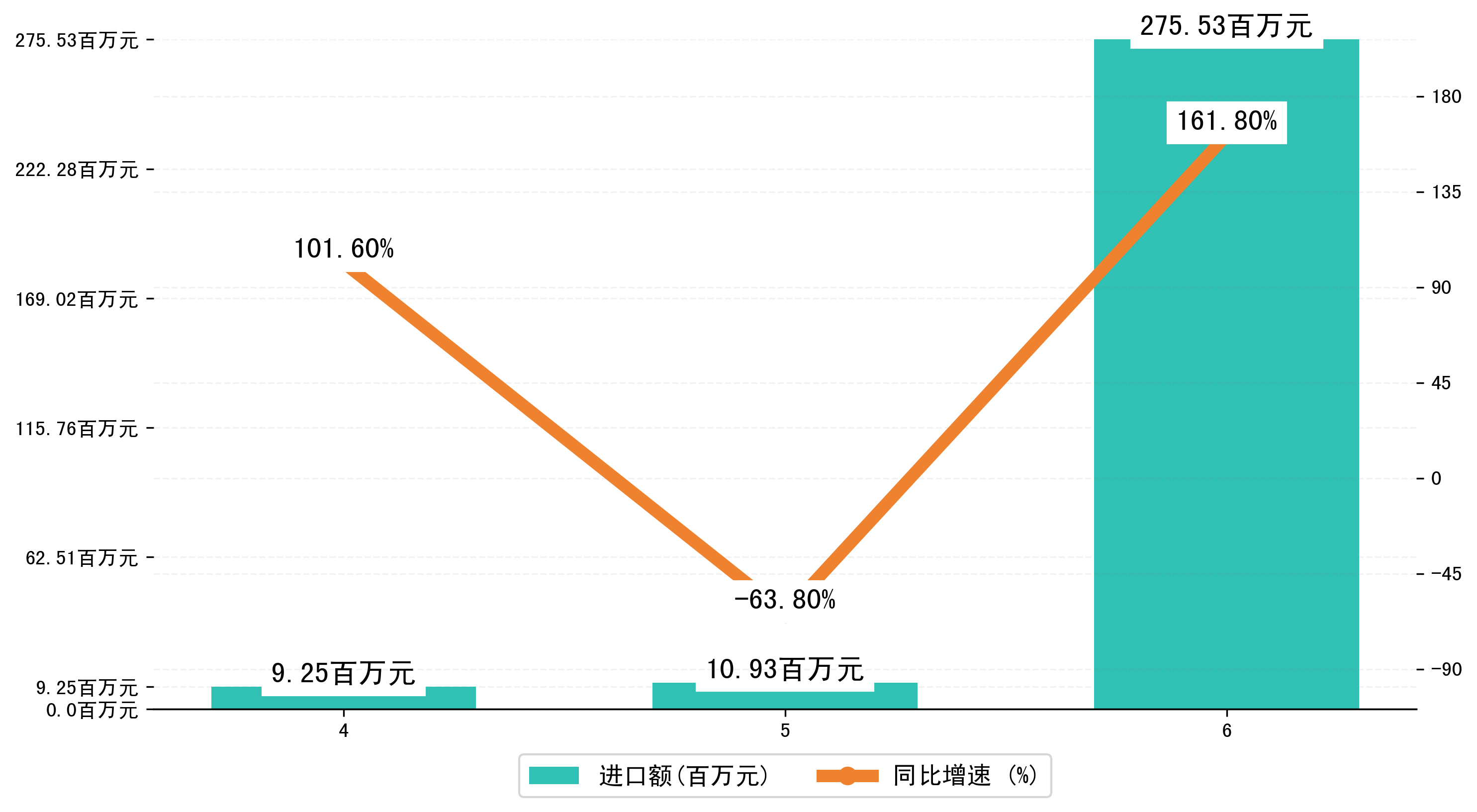 以人民币计,2023年6月广元市进口额为2,7553.3267万元,相比上月增加了2,6459.9555万元;相比上年同期增加了2,7119.7432万元,同比增加了161.80%。