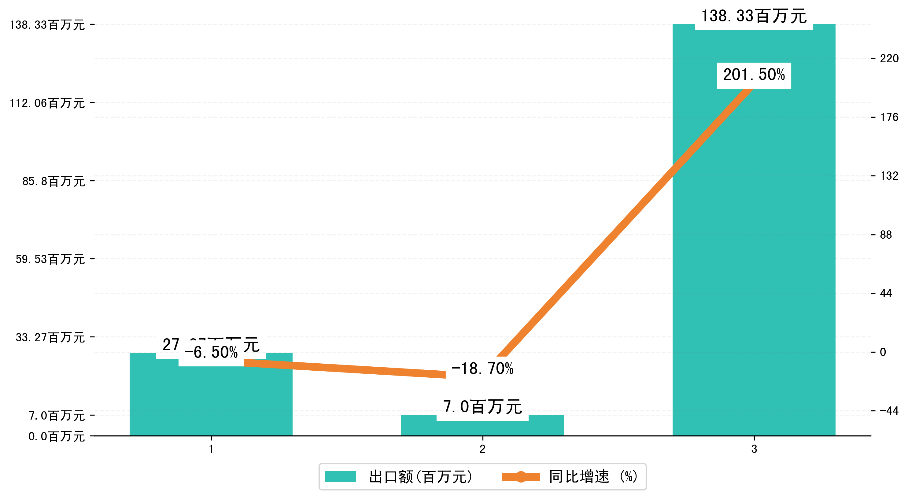 以人民币计,2025年3月广元市出口额为1,3832.8558万元,相比上月增加了1,3132.4565万元;相比上年同期增加了1,2376.5558万元,同比增加了201.50%。