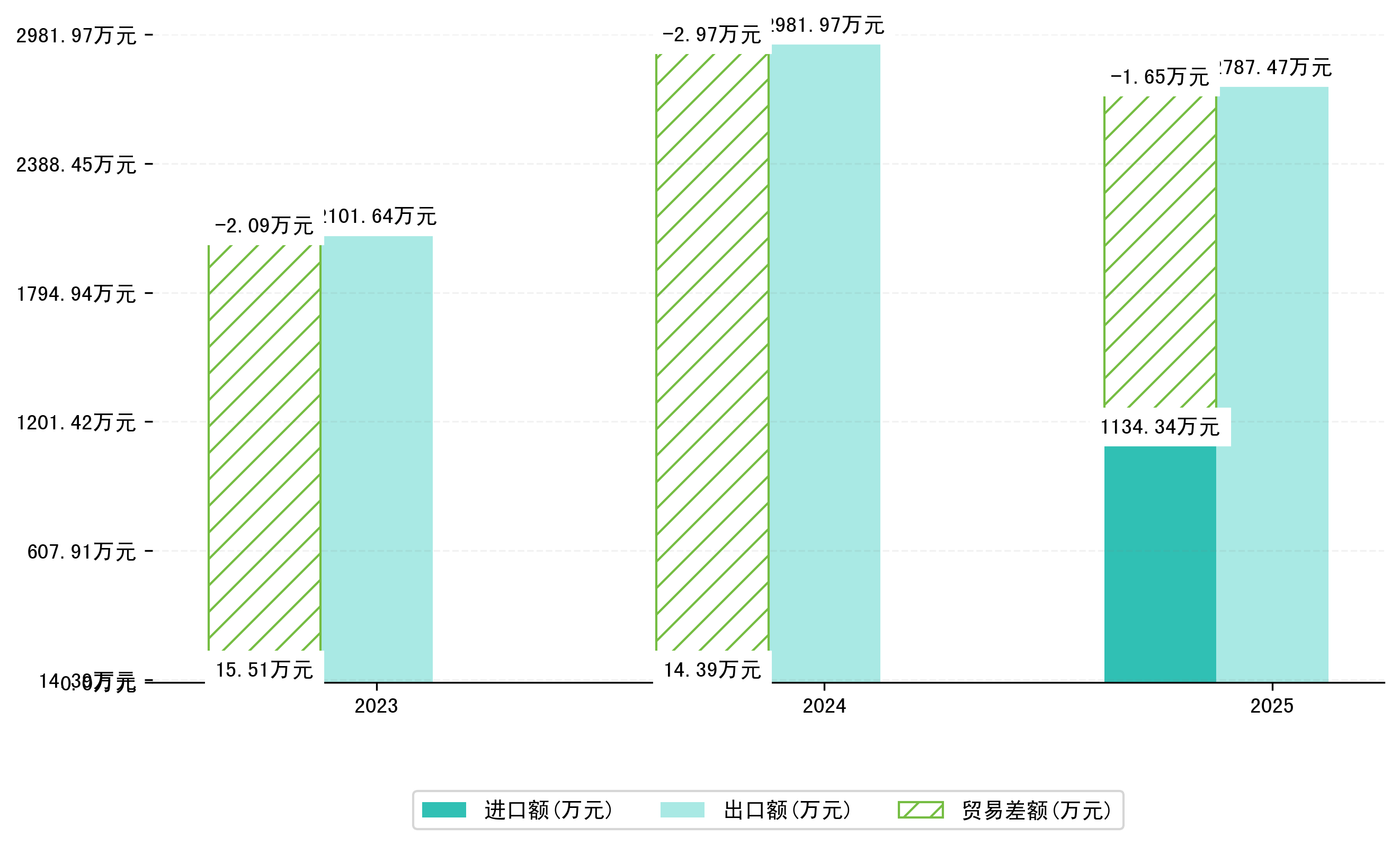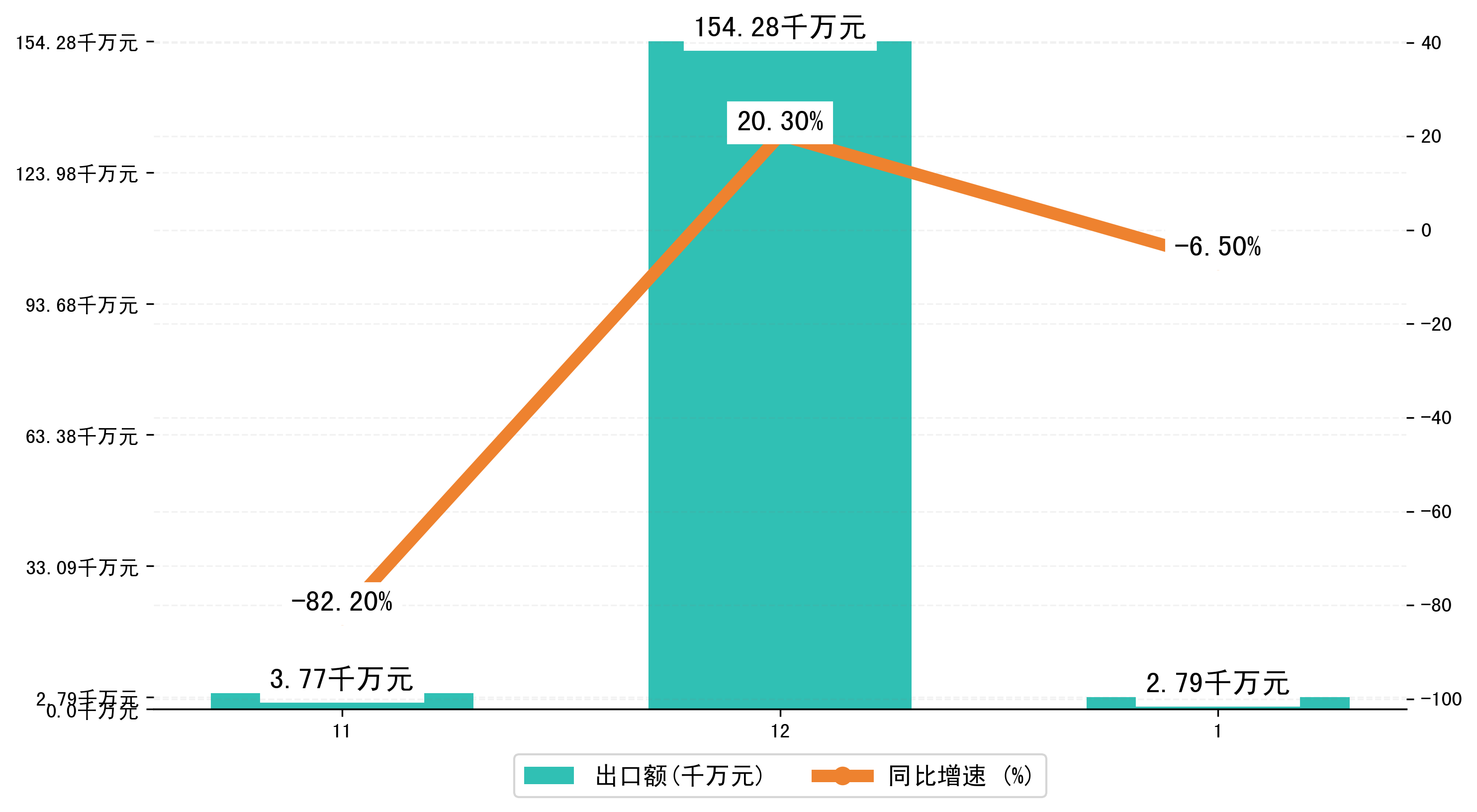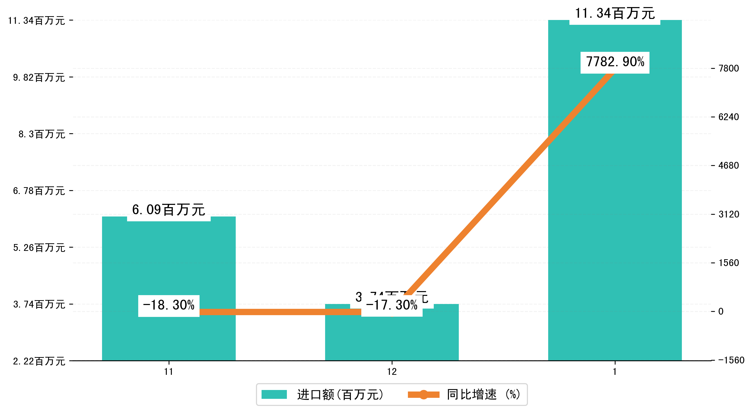 以美元计,2025年1-1月广元市进口额为158.2032万美元,相比上年同期增加了156.1734万美元,同比增加7694.00%。
