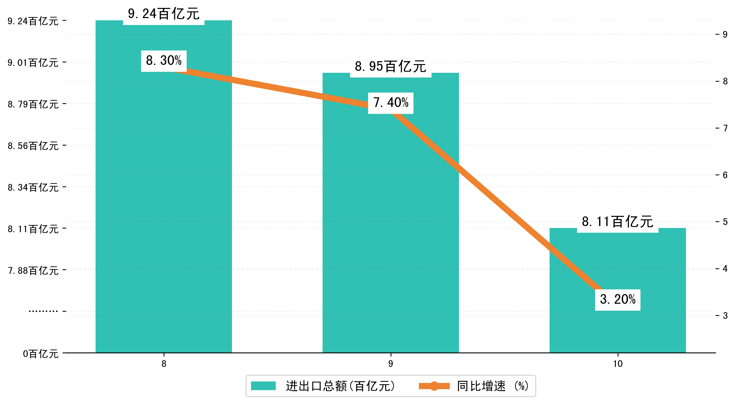 以人民币计,2023年10月广州市进出口总额为810,9749.9644万元,相比上月减少了84,1160.6491万元;相比上年同期减少了274,5083.7153万元,同比增加了3.20%。