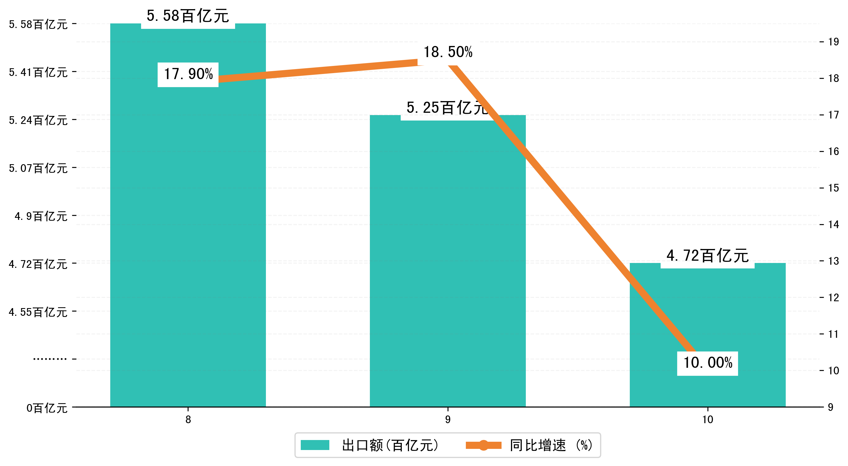 以人民币计,2023年1-10月广州市出口额为5331,6582.1022万元,相比上年同期增加了447,7045.5235万元,同比增加了10.00%。