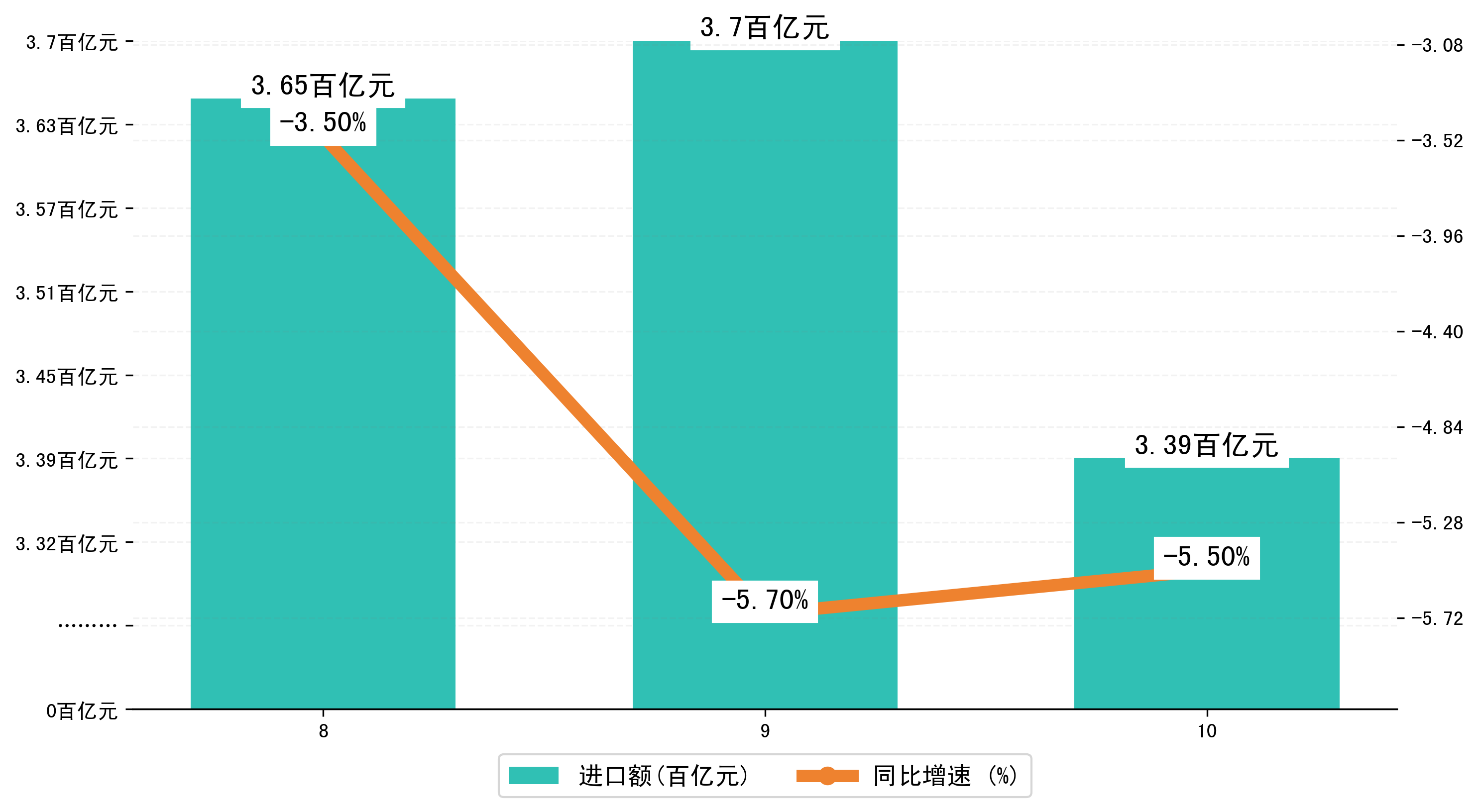以人民币计,2023年10月广州市进口额为338,5338.0422万元,相比上月减少了31,0835.2755万元;相比上年同期减少了8,5778.0496万元,同比减少了-5.50%。