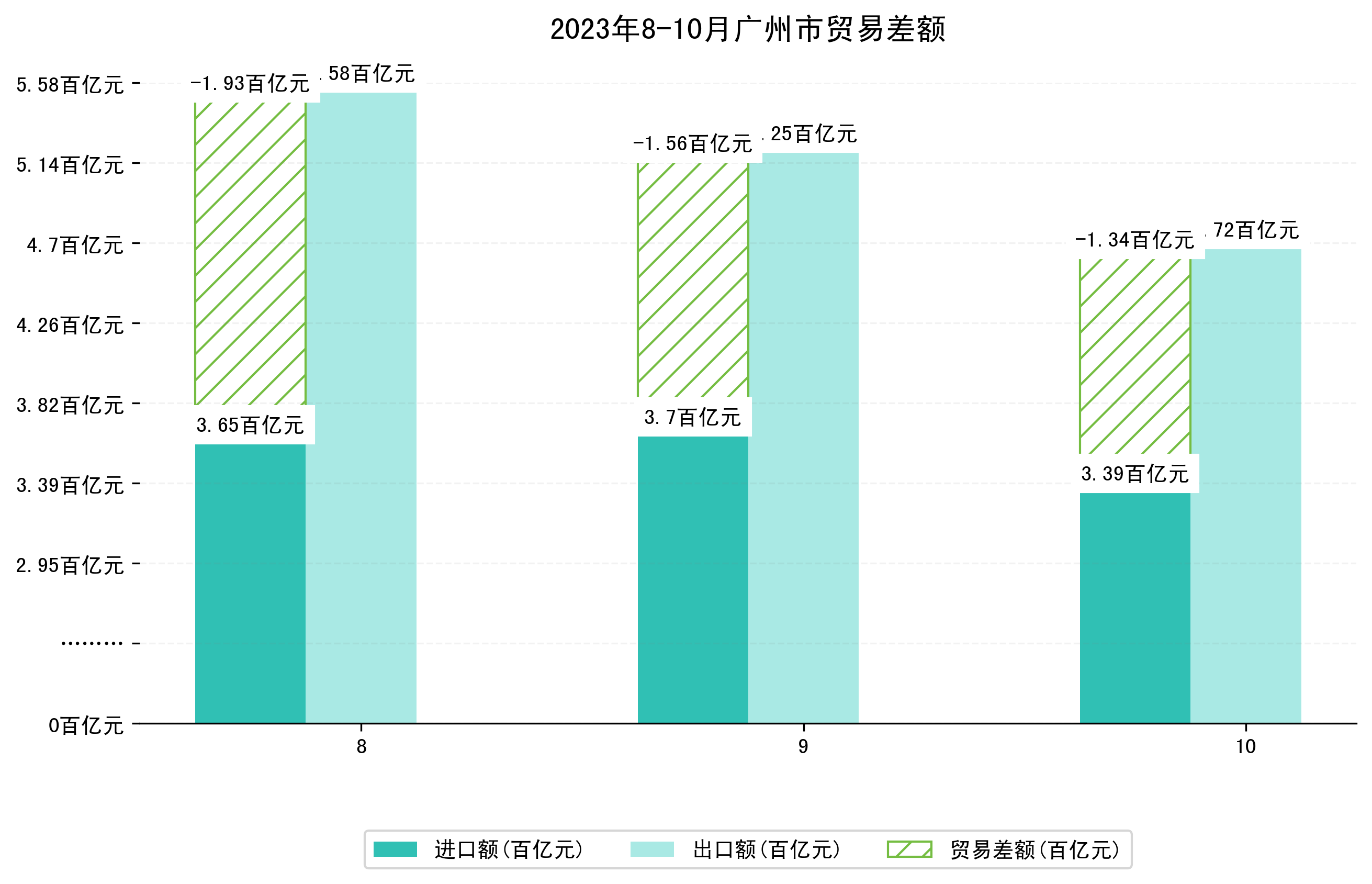 以人民币计,2023年1-10月广州市贸易差额为1705,5077,9094万元(贸易顺差),相比上年同期增加了657,8829,9329万元,同比增加62.8%。
