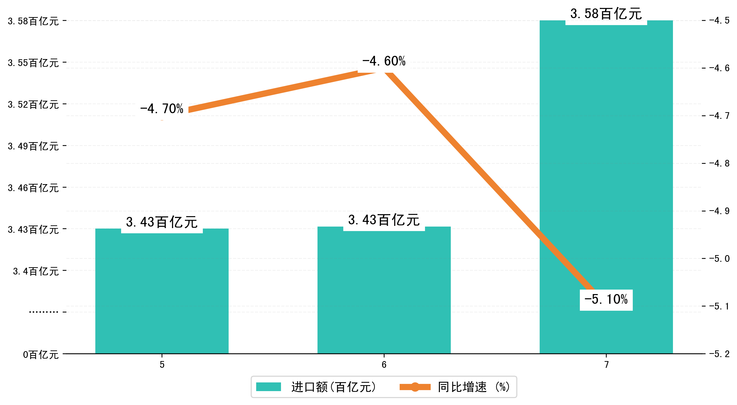以人民币计,2024年7月广州市进口额为358,1730.6726万元,相比上月增加了15,0133.7352万元;相比上年同期减少了18,8686.9279万元,同比减少了-5.10%。