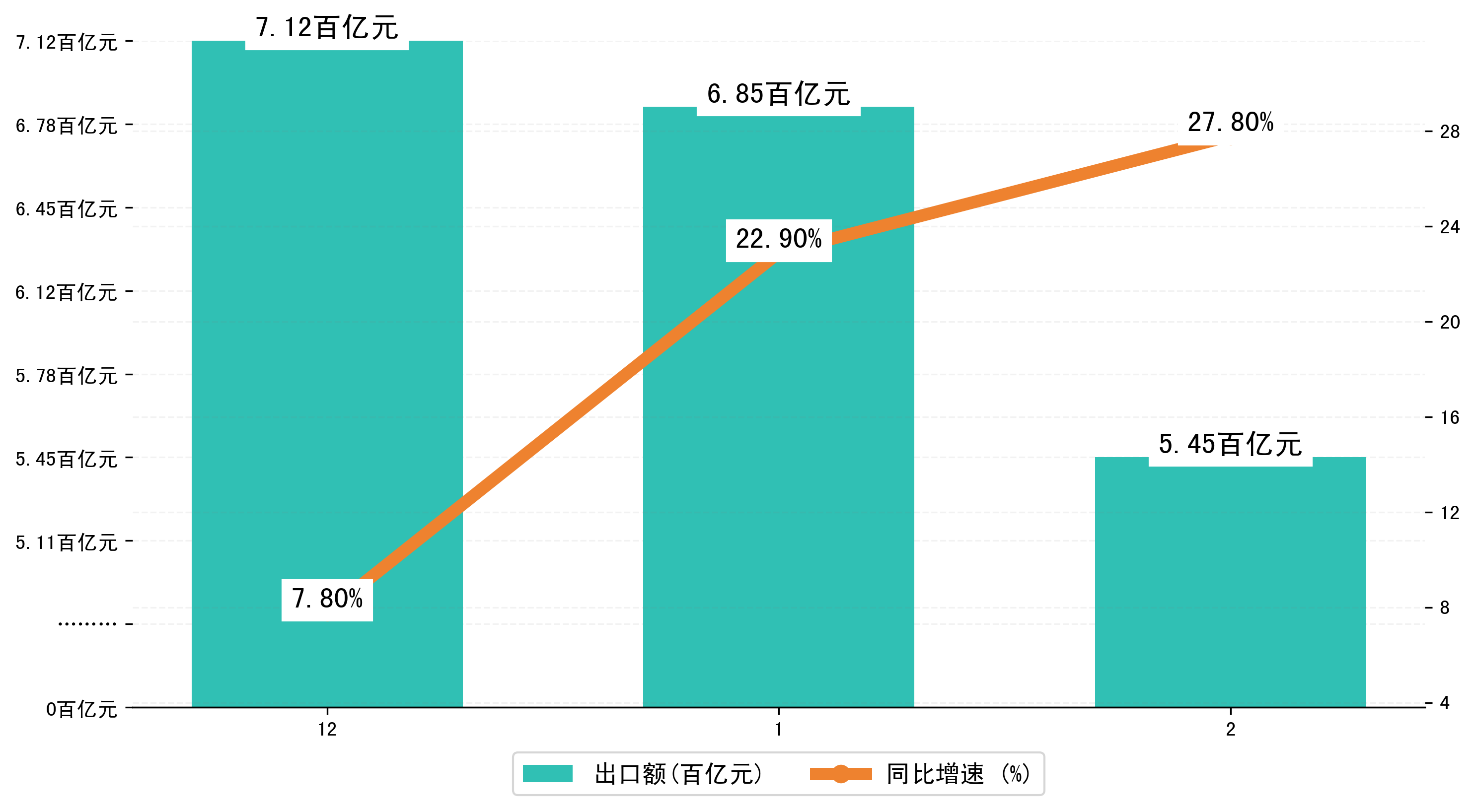 以人民币计,2025年2月广州市出口额为544,8007.3761万元,相比上月减少了140,4816.208万元;相比上年同期增加了169,0344.861万元,同比增加了27.80%。