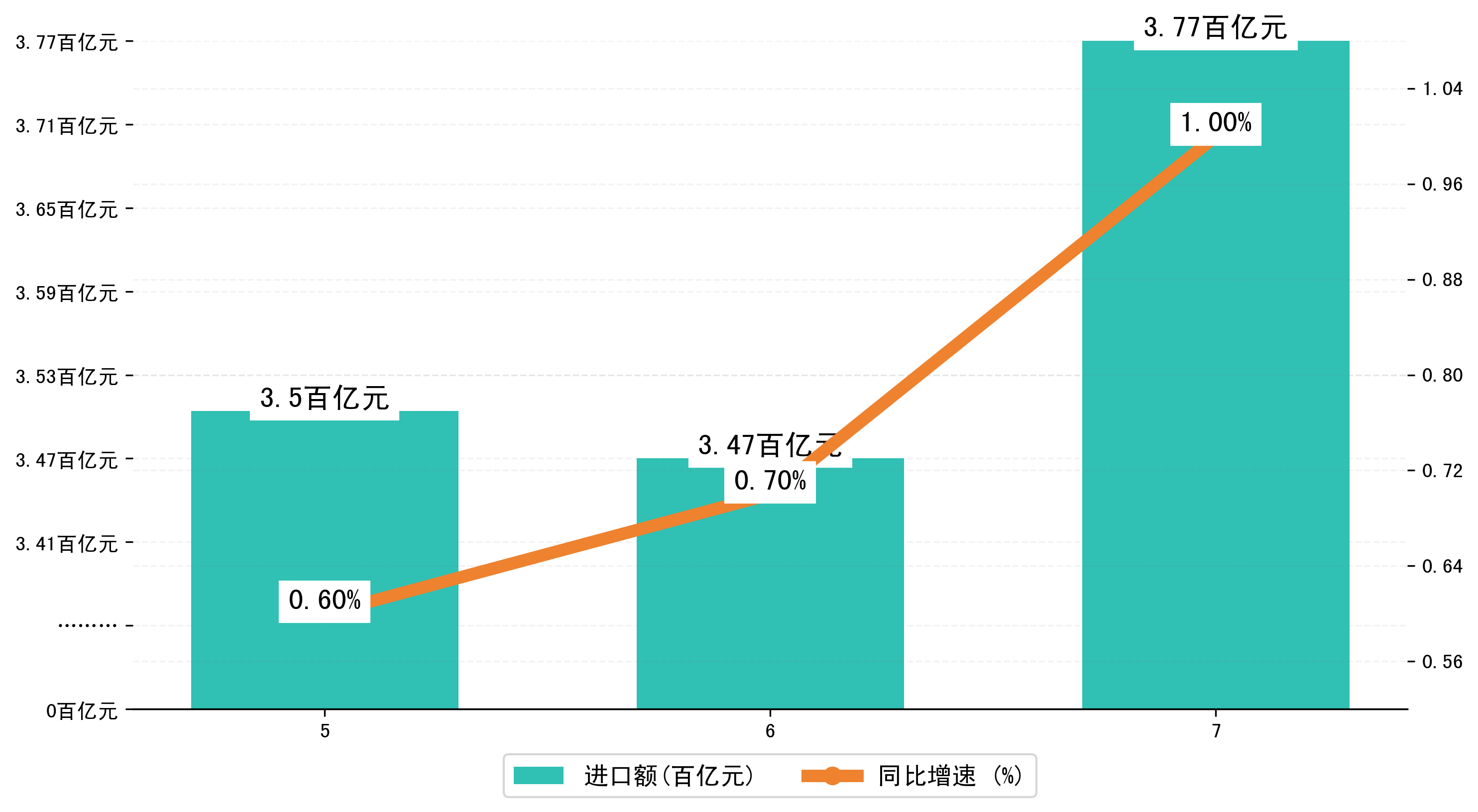 以人民币计,2025年7月广州市进口额为376,7482.8486万元,相比上月增加了29,7926.1746万元;相比上年同期增加了18,5752.176万元,同比增加了1.00%。