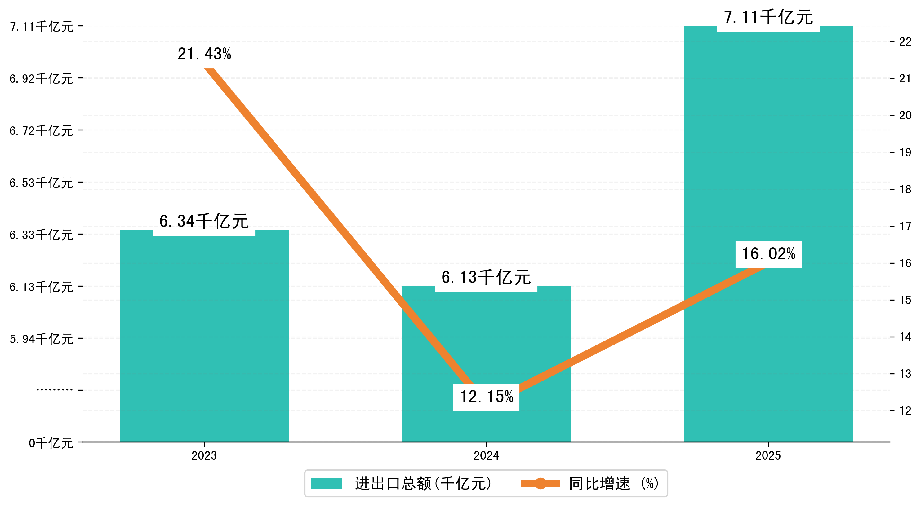 以人民币计,2025年1-7月广州市进出口总额为7114,5900.7817万元,相比上年同期增加了982,2198.3708万元,同比增加了14.50%。