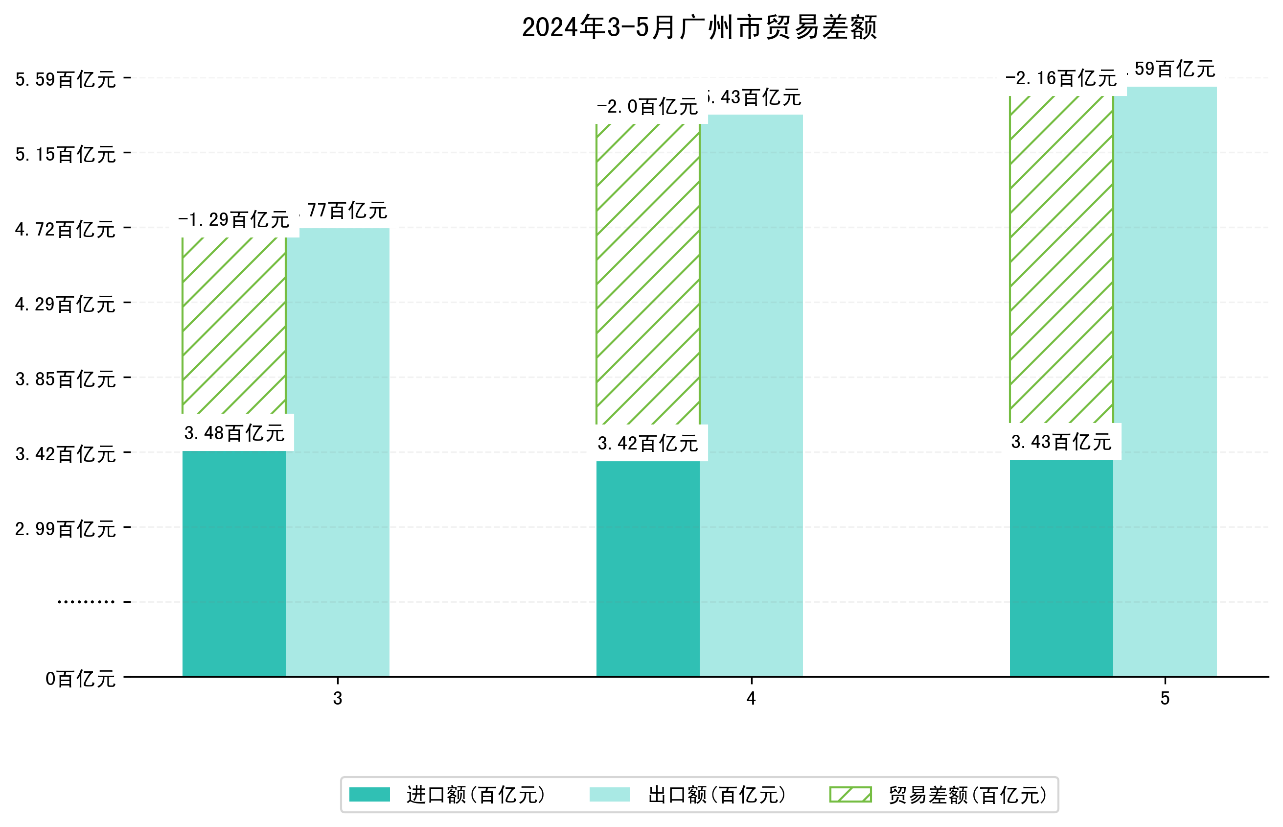 以人民币计,2024年5月广州市贸易差额为215,7475,2374万元(贸易顺差),相比上月增加了15,3924,1740万元,即2,1523,2094万美元;相比上年同期增加了49,7767,3177万元,同比增加29.99%。