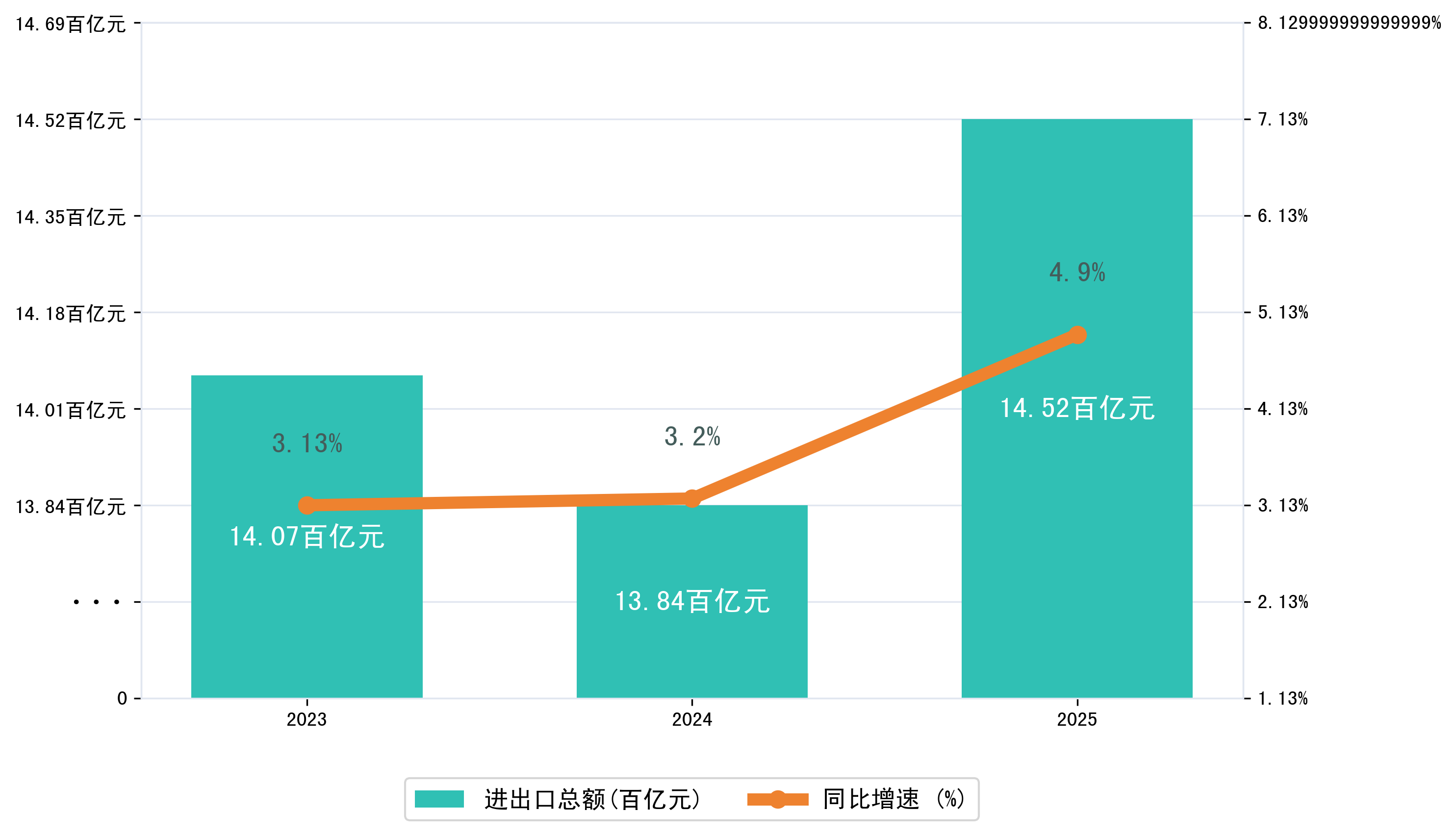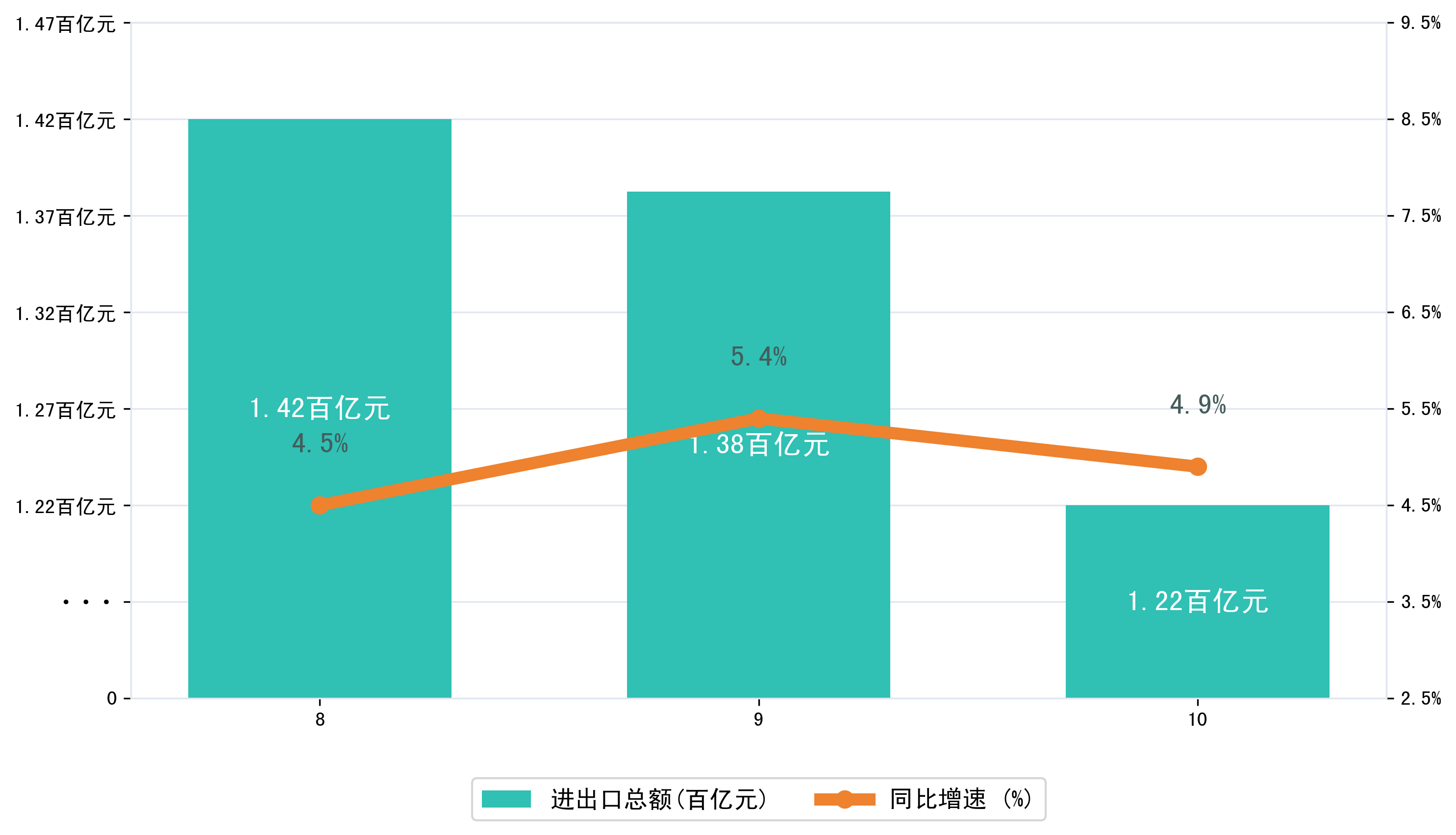 以人民币计,2025年1-10月湖州市进出口总额为1451,8776.5856万元,相比上年同期增加了67,8739.6313万元,同比增加了4.90%。