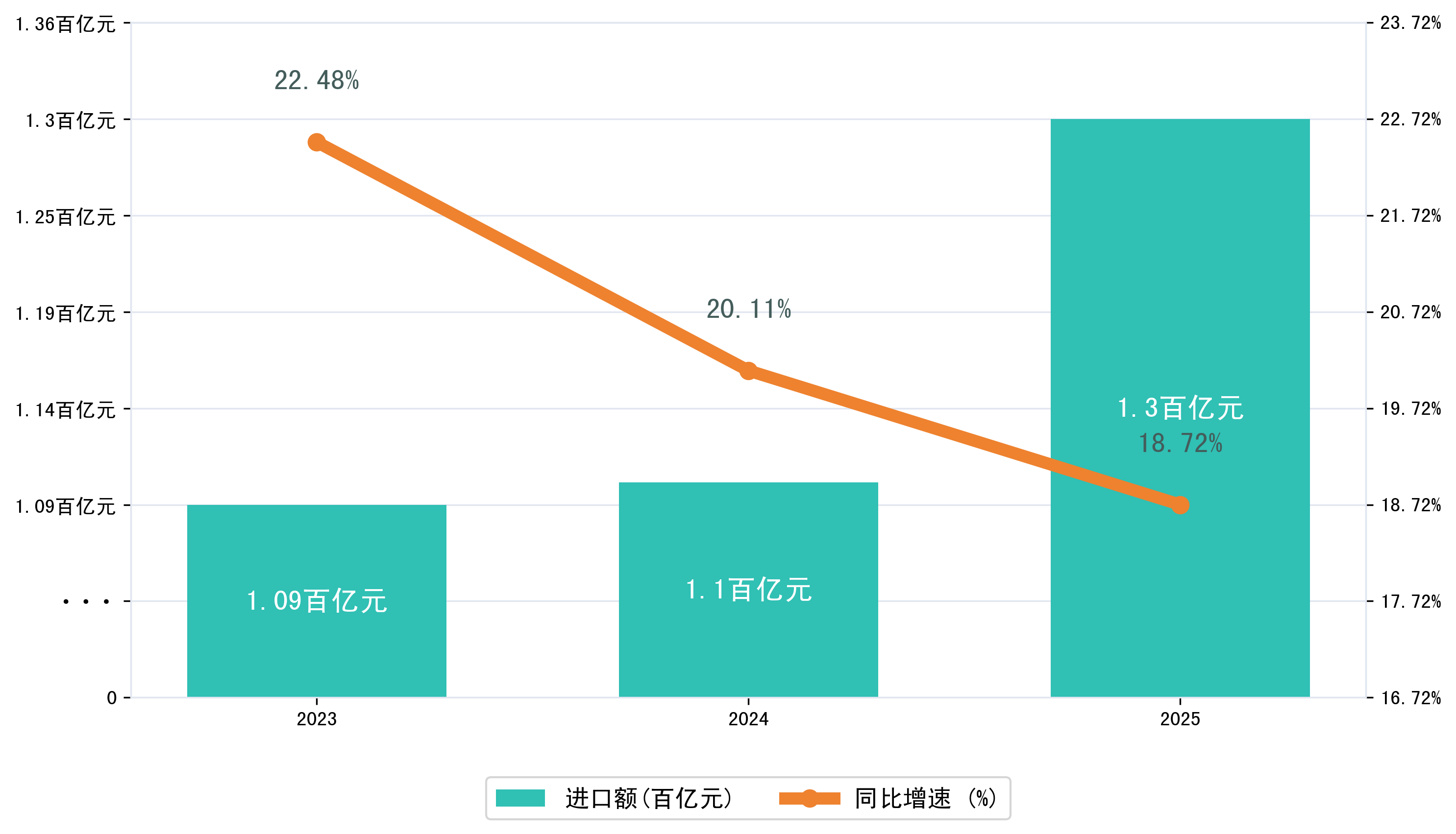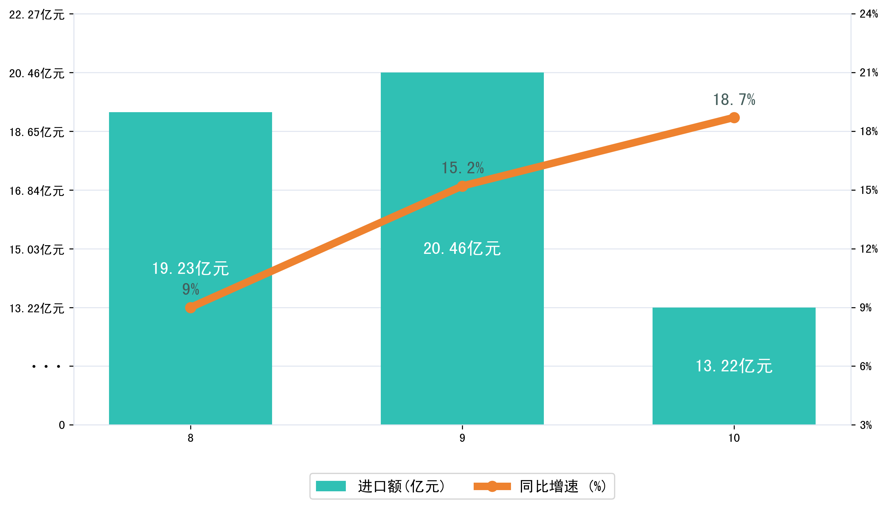以人民币计,2025年1-10月湖州市进口额为130,3237.2298万元,相比上年同期增加了20,5484.3278万元,同比增加了18.70%。