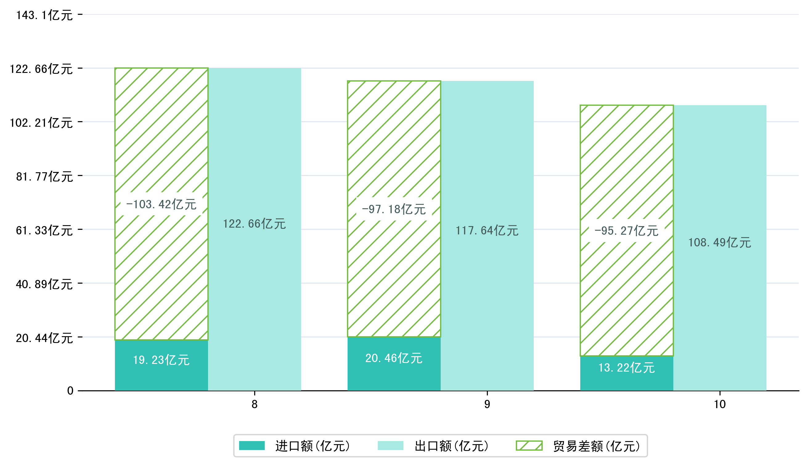 以人民币计,2025年10月湖州市贸易差额为95,2745,3696万元(贸易顺差),相比上月减少了1,9094,2736万元,即2099,8077万美元;相比上年同期减少了10,8397,1012万元,同比减少-10.22%。